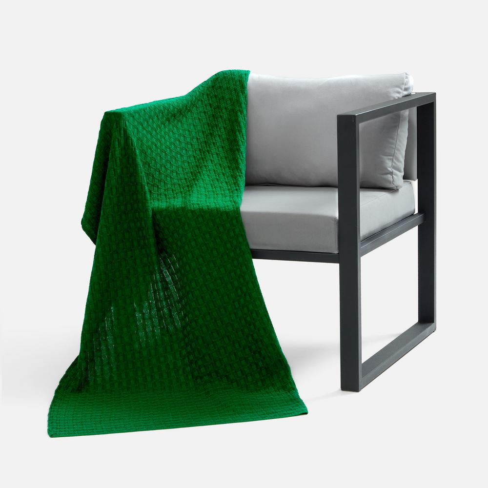 Модель: однотонный плед с фактурной вязкой, которая позволяет сделать его воздушным и объемным. Чередуя различные типы петель на гладком полотне, можно вывязать любую графику логотип, текст, товарный знак.