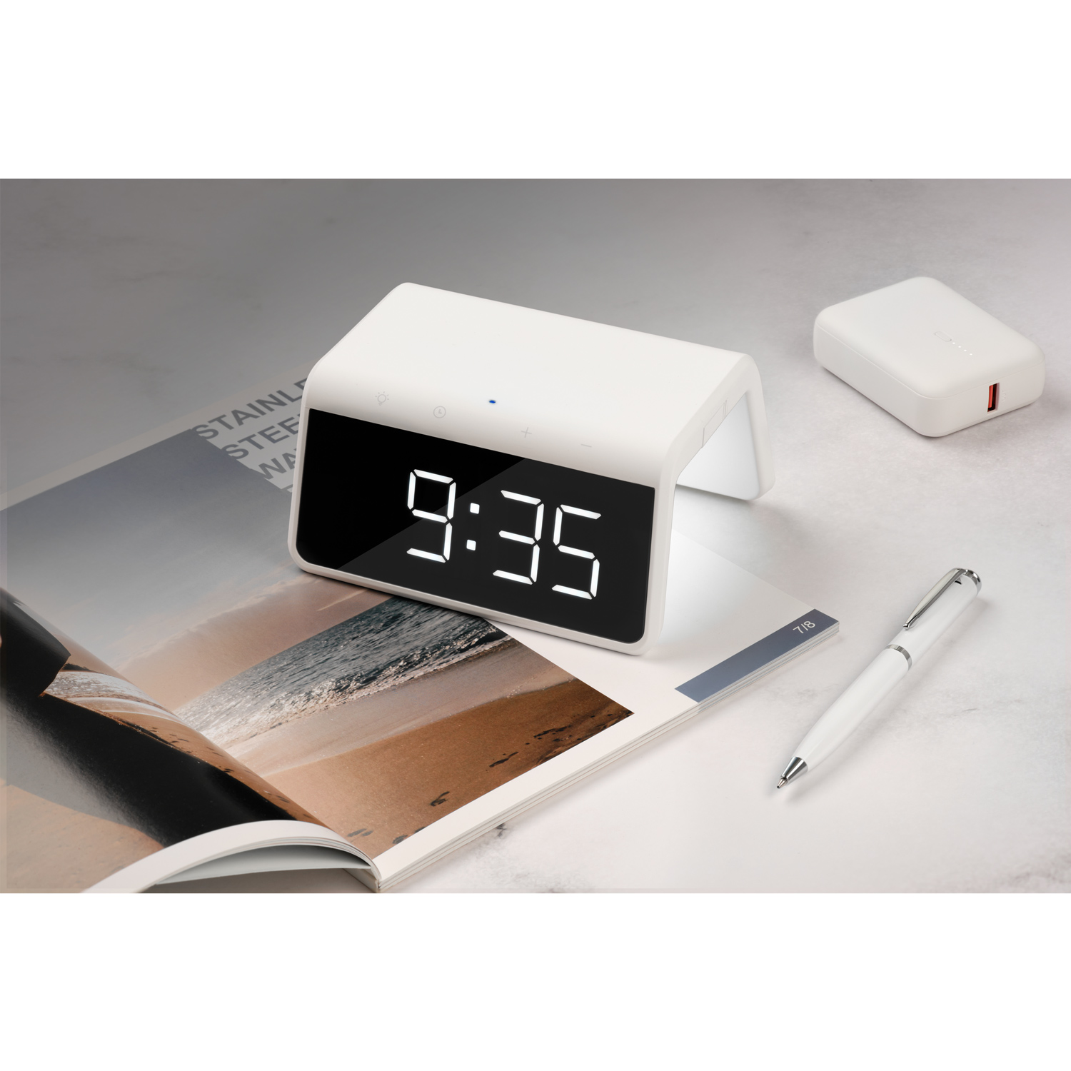 Зарядная станция Flame 15W с часами от Portobello – многофункциональный гаджет для бизнес-пространств, объединяющий беспроводную зарядку до 15Вт, USB-A порт, часы с будильником и 9-режимную RGB-подсветку (белый, красный, желтый, светло-зелёный, зелёный, светло-голубой, синий, розовый). Совместима с iPhone, Samsung и другими Qi-устройствами. Компактный корпус 145х116х73 мм с эргономичным дизайном идеально впишется в офисный интерьер, превращаясь в стильный корпоративный подарок для партнеров или премиальный промо-сувенир для клиентов.