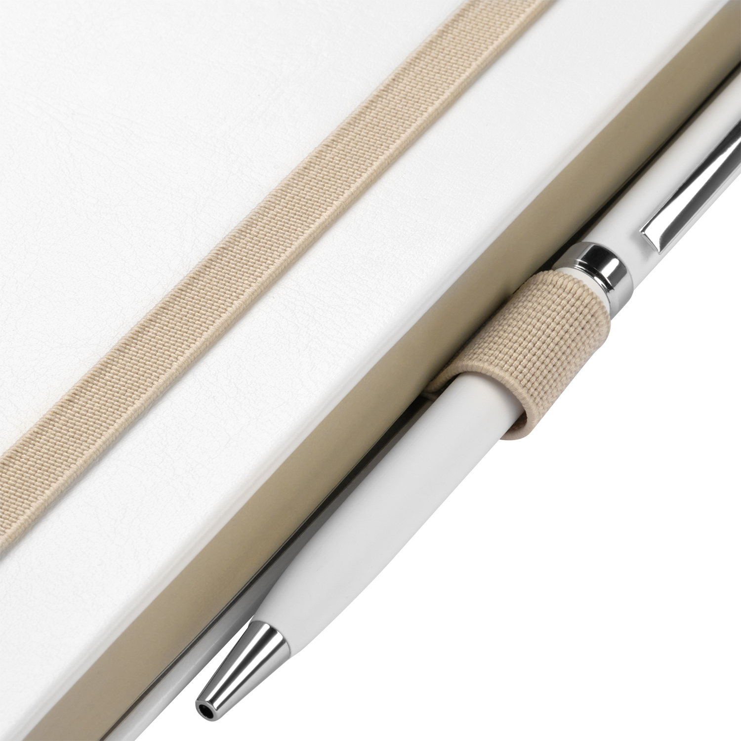 Недатированный ежедневник выполнен в жесткой обложке из искусственной кожи со скругленными уголками. Переплетный материал гладкий, с легкой естественной паутинкой морщин, имеет полуглянцевый блеск. Цвет – чистый белый. Черные матовые форзац и нахзац, а также черный срез блока создают оригинальный динамичный цветовой ансамбль и подчеркивают белизну обложки. Страницы светло-кремового цвета, из гладкого офсета, слегка шелковистые, со скругленными уголками. Добавляют изделию мягкую комфортную теплоту. Двойное атласное ляссе составлено из черной и белой лент. Каждая шириной 6 мм, имеет легкий блеск. Вертикальная фиксирующая резинка прочная, надежная и удобная, в тон срезу. Есть петелька для ручки в тон резинки. Карман на заднем форзаце.