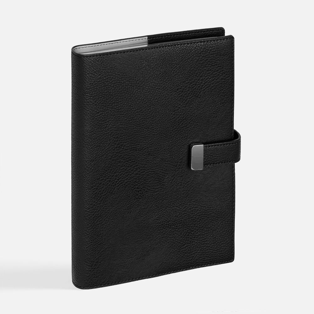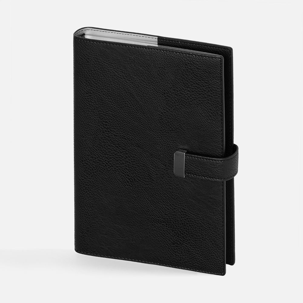 Ежедневник в мягком переплете со съемной обложкой, дополнен застежкой-хлястиком с металлическим шильдом на кнопке, двойным ляссе и капталом.