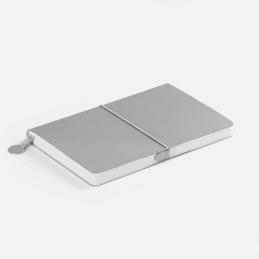 Ежедневник с гибкой обложкой, выполнен из материала Waltz, серебристый DD, дополнен ляссе в цвет обложки с металлическим шильдом.