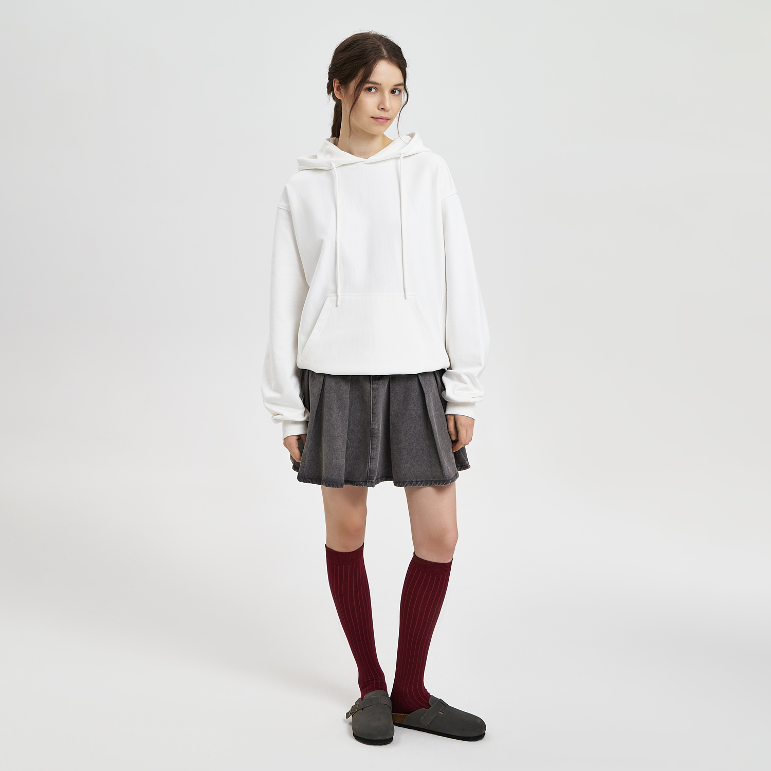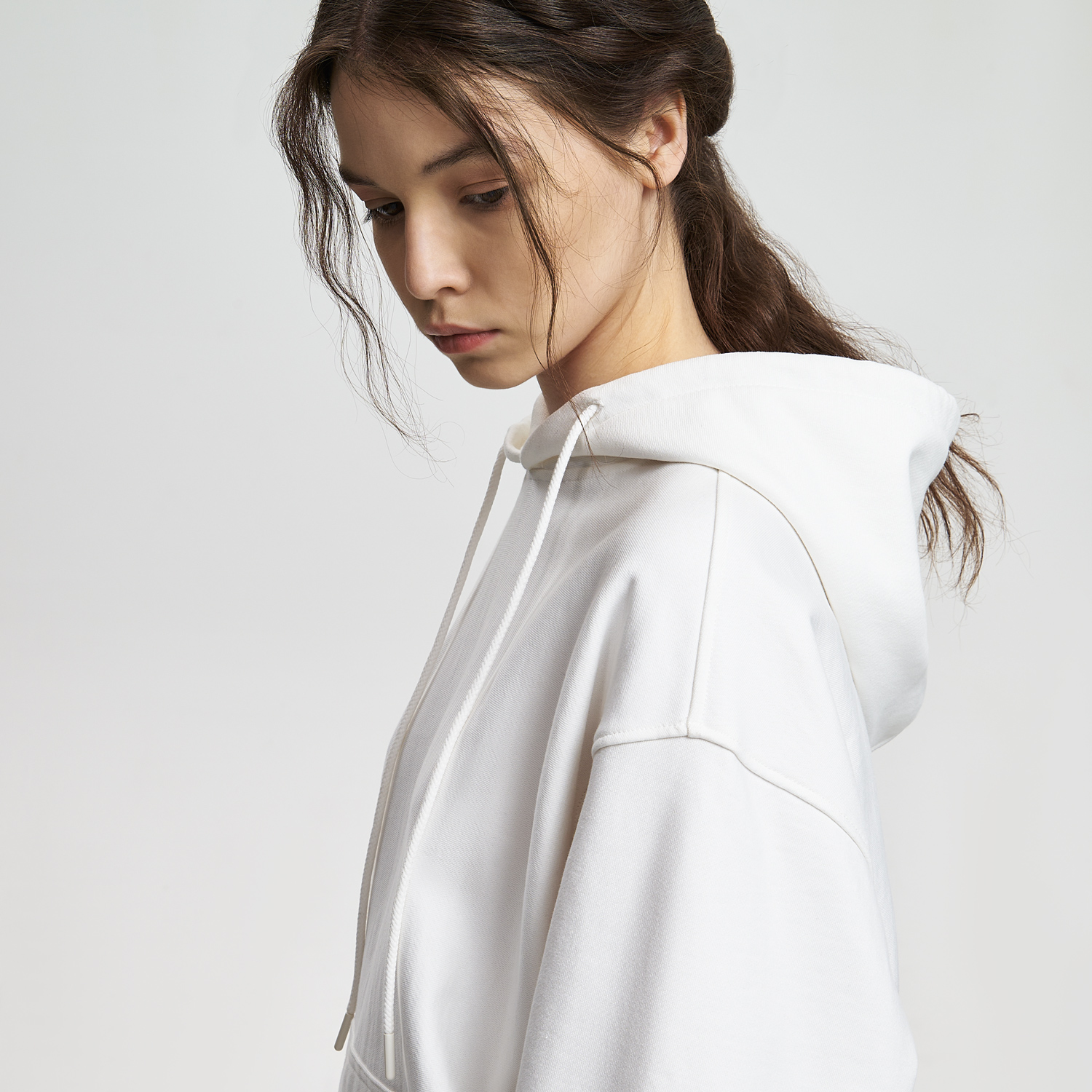 Модель выполнена из хлопкового футера плотностью 420 г/м (без начёса). Плотная, но мягкая ткань хорошо держит форму и при этом приятна к телу. Использована пряжа compact penye прочная, тактильно деликатная, высокого качества.