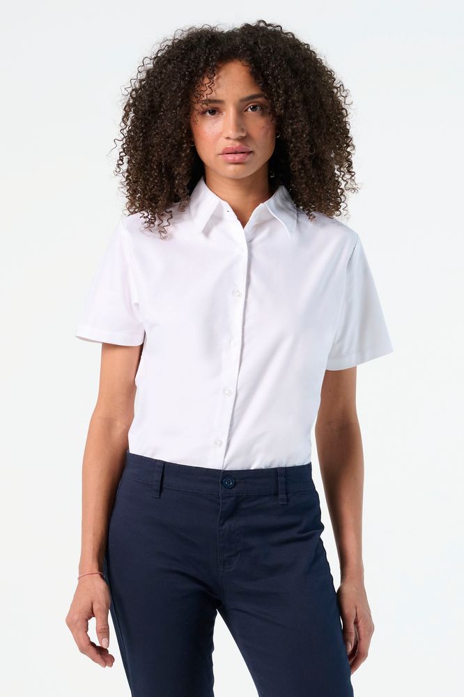 Рубашка из ткани «Оксфорд». Вытачки на груди, классический воротник, планка с семью пуговицами в тон.