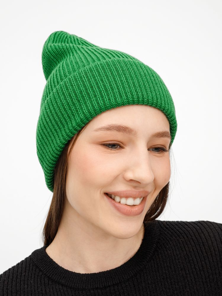 Однослойная шапка фактурной вязки с отворотом.