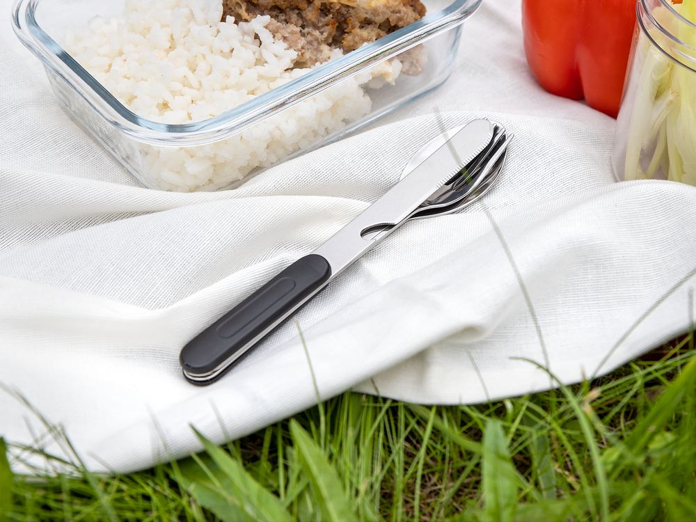 Набор столовых приборов из ложки, вилки и ножа с открывашкой с разборной конструкцией.