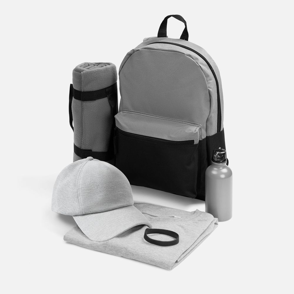 В комплект входят удобный силиконовый браслет, стильная бейсболка, функциональная бутылка для воды, легкая футболка и вместительный рюкзак, а также дорожный плед все, без чего в первую очередь не обойтись на свежем воздухе. Этот практичный и стильный набор поможет с легкостью объединить команду, гарантируя комфорт и даря только яркие впечатления.