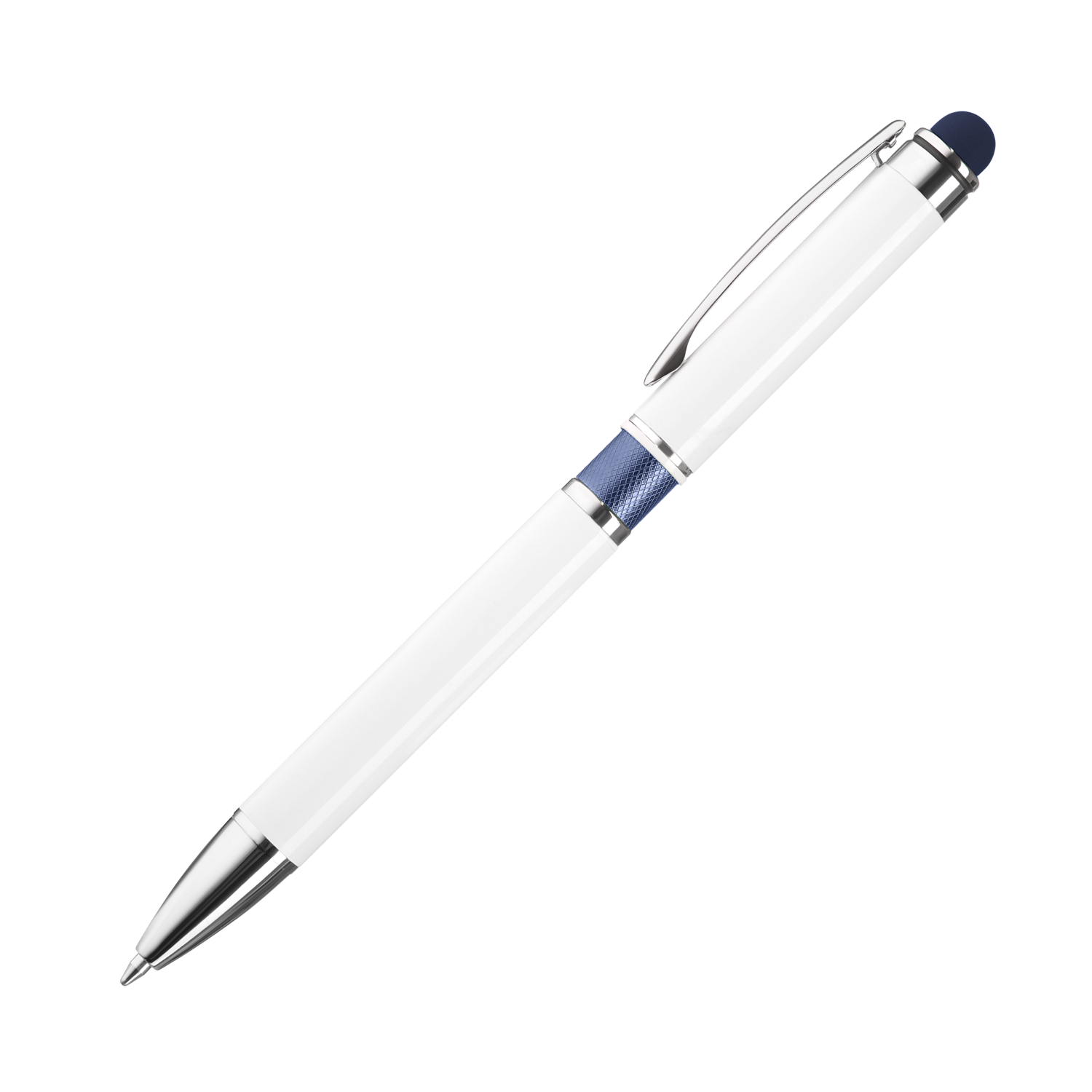 Алюминиевая ручка с белым корпусом, цветной вставкой и стилусом в цвет вставки.