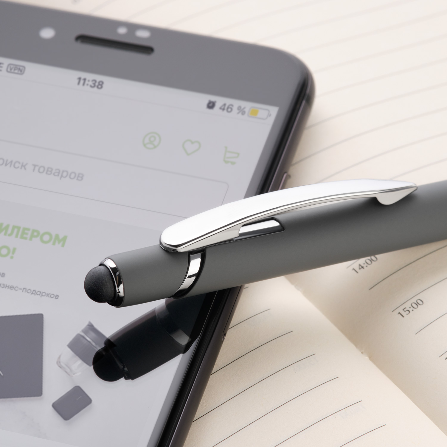 Отделка: хромированные детали, функциональный, надежный клип, оснащен стилусом для работы с сенсорными экранами