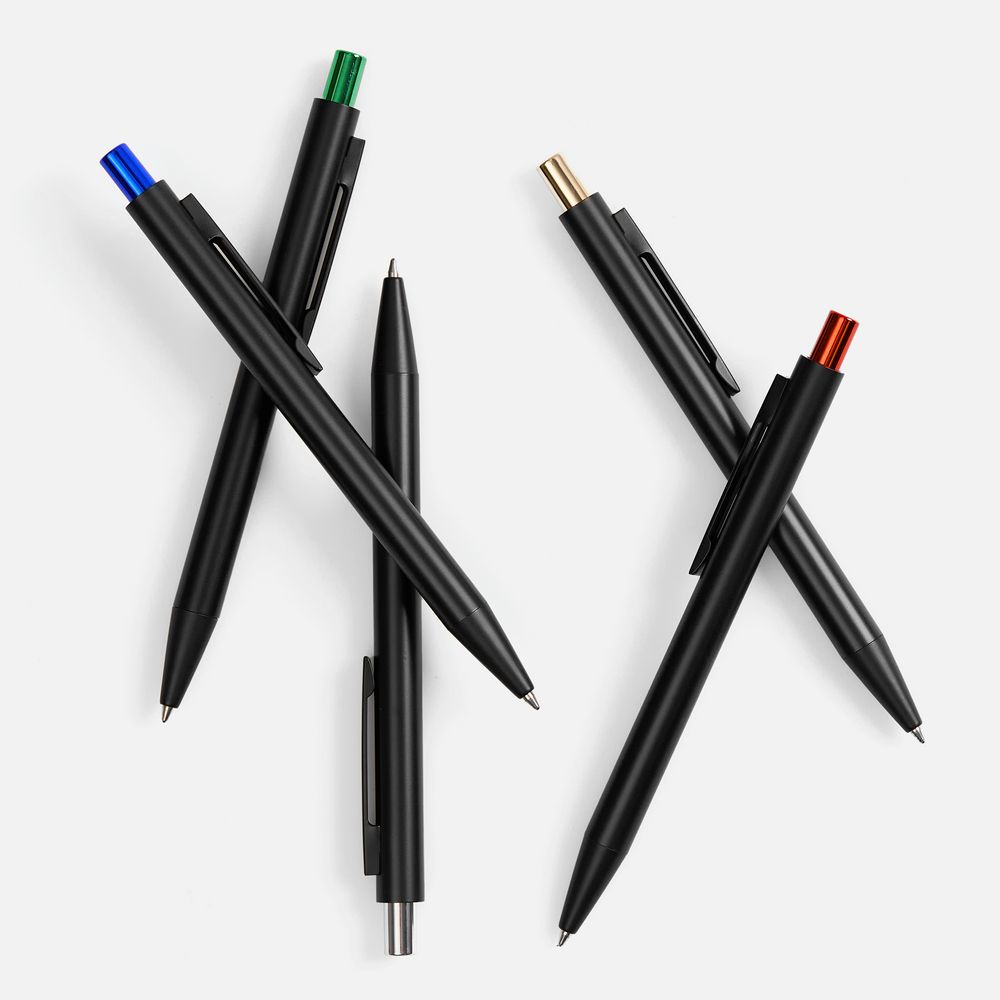 Ручка строгих форм в черном матовом корпусе с цветными деталями, которая точно может удивить, гравировка на ней вскрывается цветом в тон кнопке.