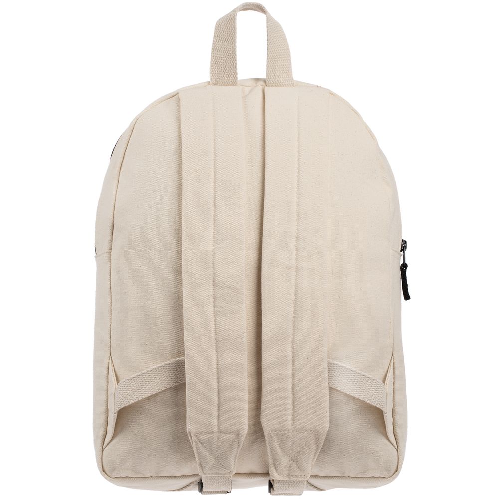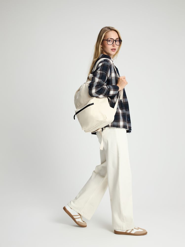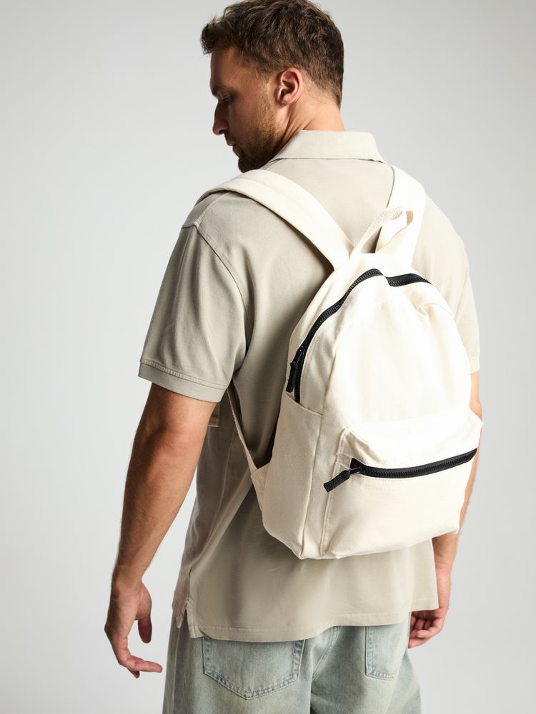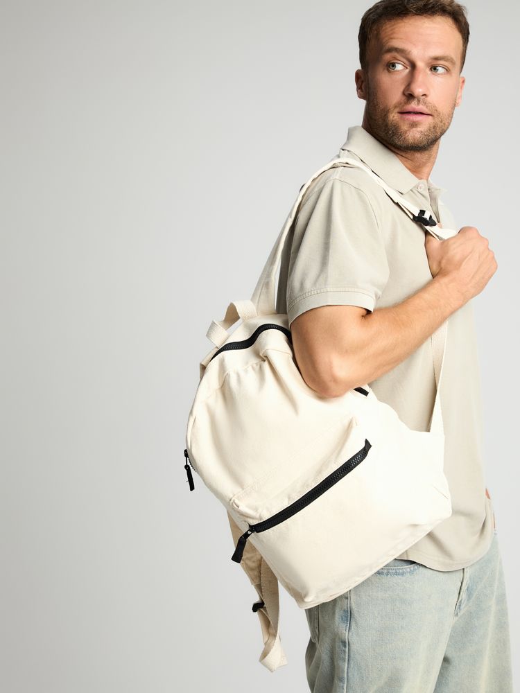 Легкий рюкзак в экостиле из плотного неокрашенного хлопка с контрастными деталями.