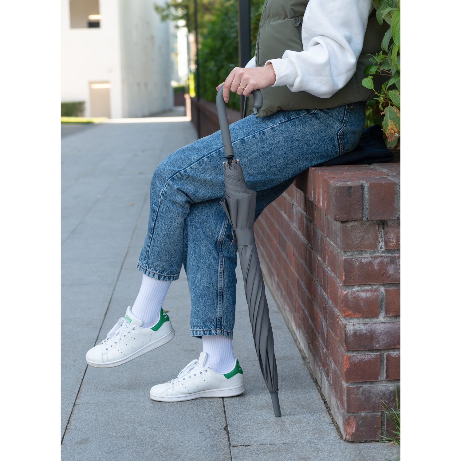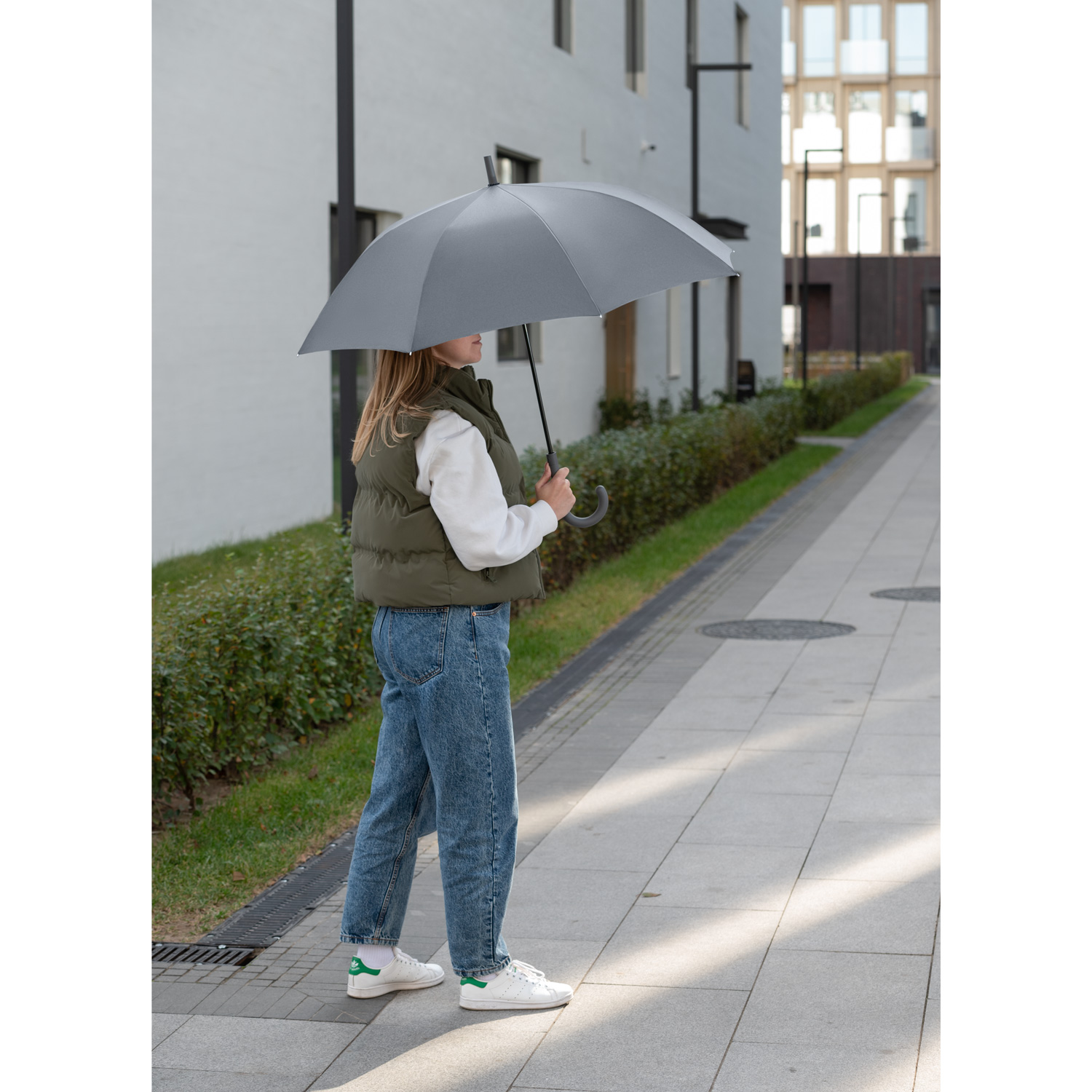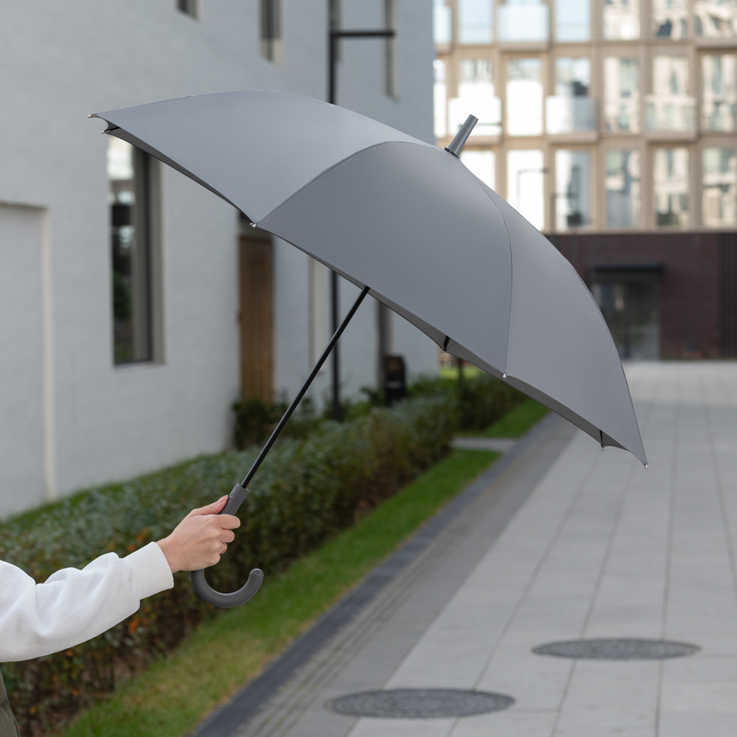 Зонт оснащен системой антиветер, что позволяет спицам не ломаться даже при сильном порыве ветра.