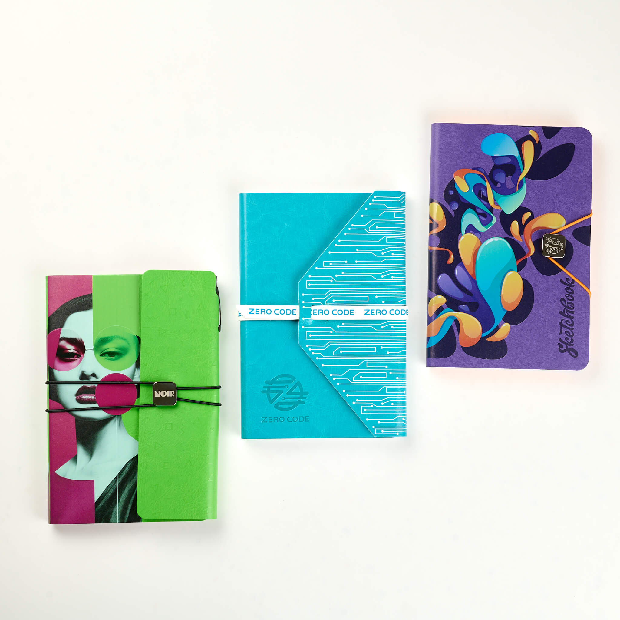 Каталог готовых решений включает уже сшитые блокноты, на которые мы оперативно наносим ваш логотип (на обложку). При производстве на заказ мы с нуля печатаем ваши внутренние страницы (индивидуальный блок), подбираем фурнитуру и материалы переплета.