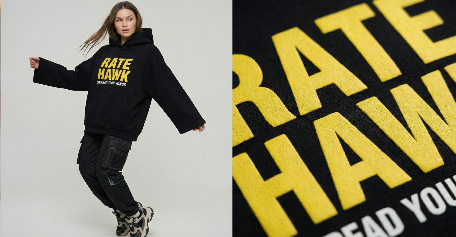 Для fashion-коллекций мы подбираем технологию под конкретную ткань: шелкографию красками на водной основе (для мягких, дышащих принтов, не утяжеляющих ткань), премиальную вышивку (для статусного и долговечного брендирования), а также DTF-печать для сложных полноцветных изображений с высокой детализацией