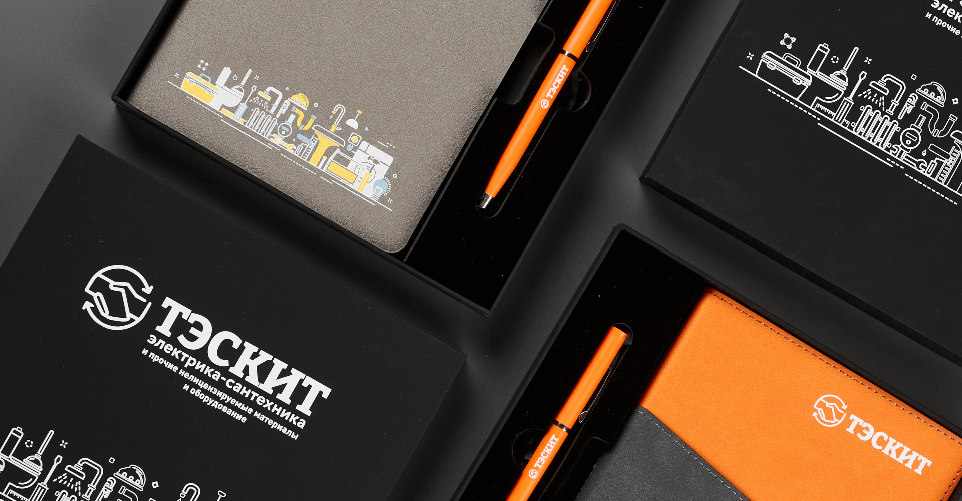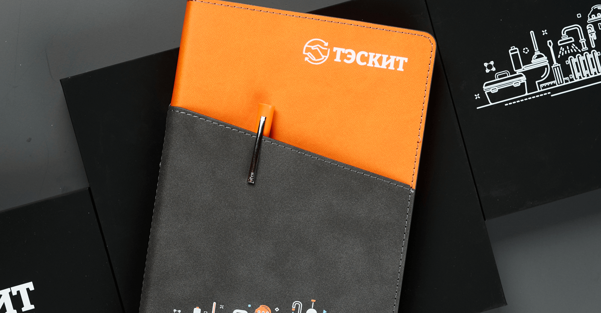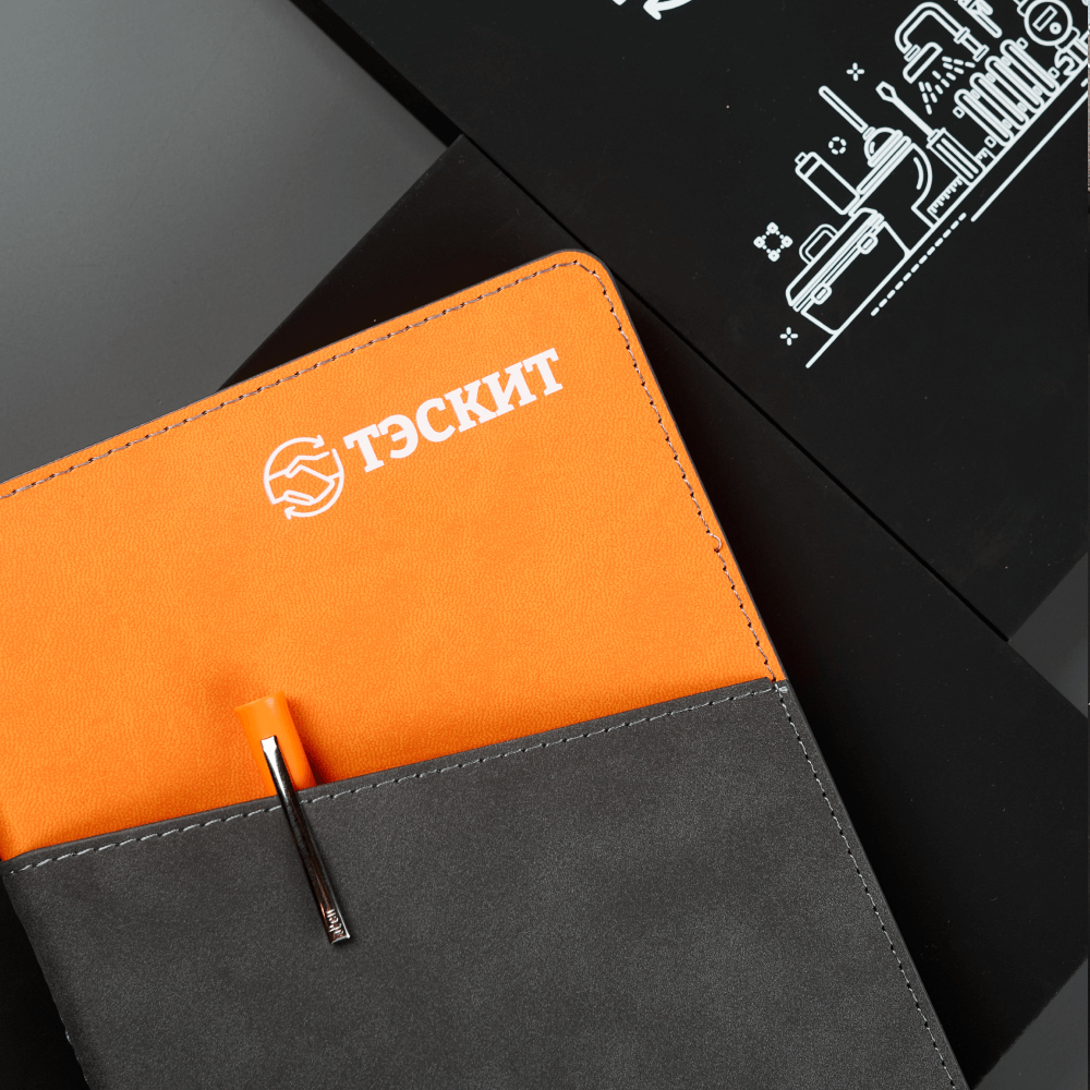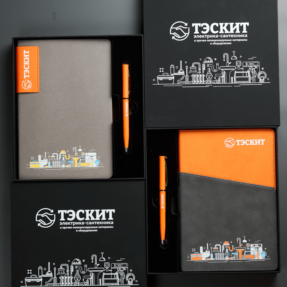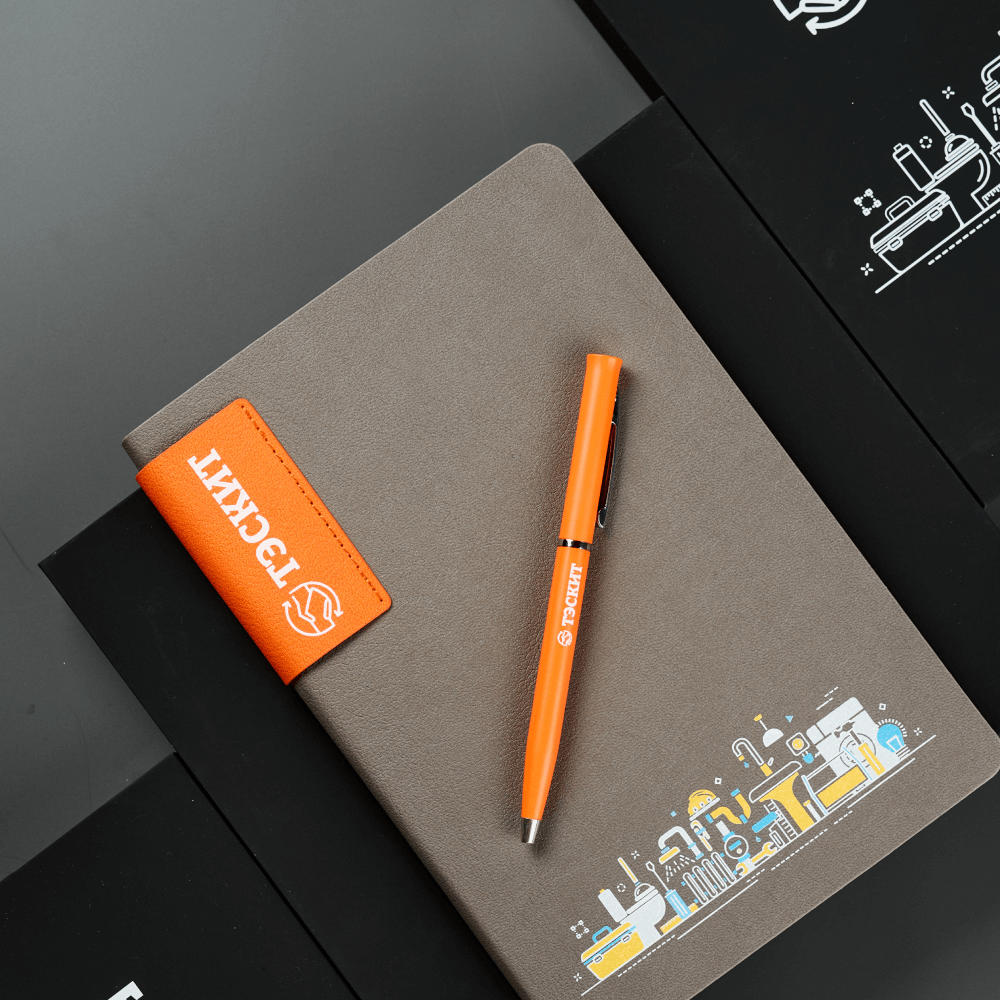 На коробках, обложках и ручках мы наносим логотип и фирменные элементы дизайна методом УФ печати от тиража 20 штук. Благодаря этому каждый предмет набора работает как носитель бренда, а вся композиция выглядит как единая визуальная система, созданная специально для компании.