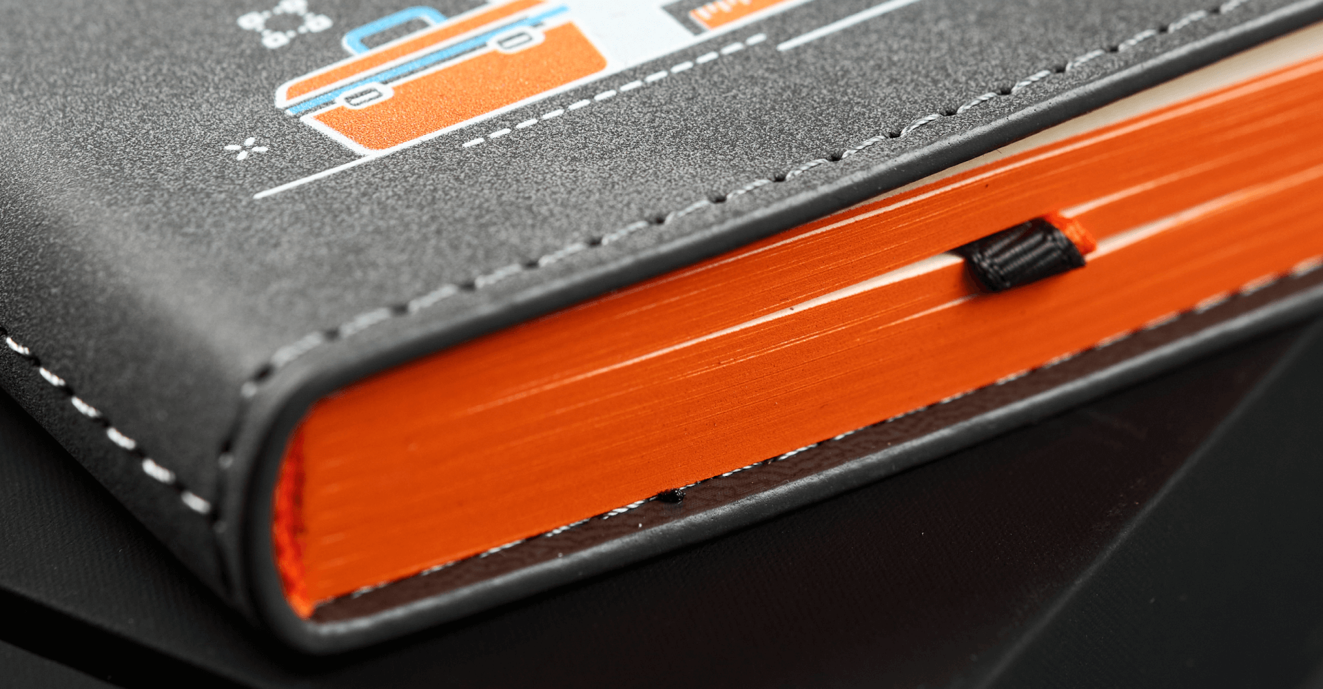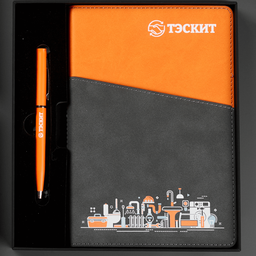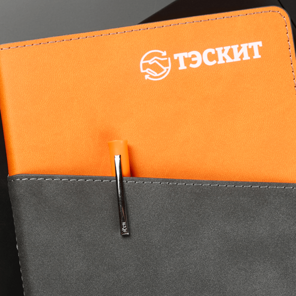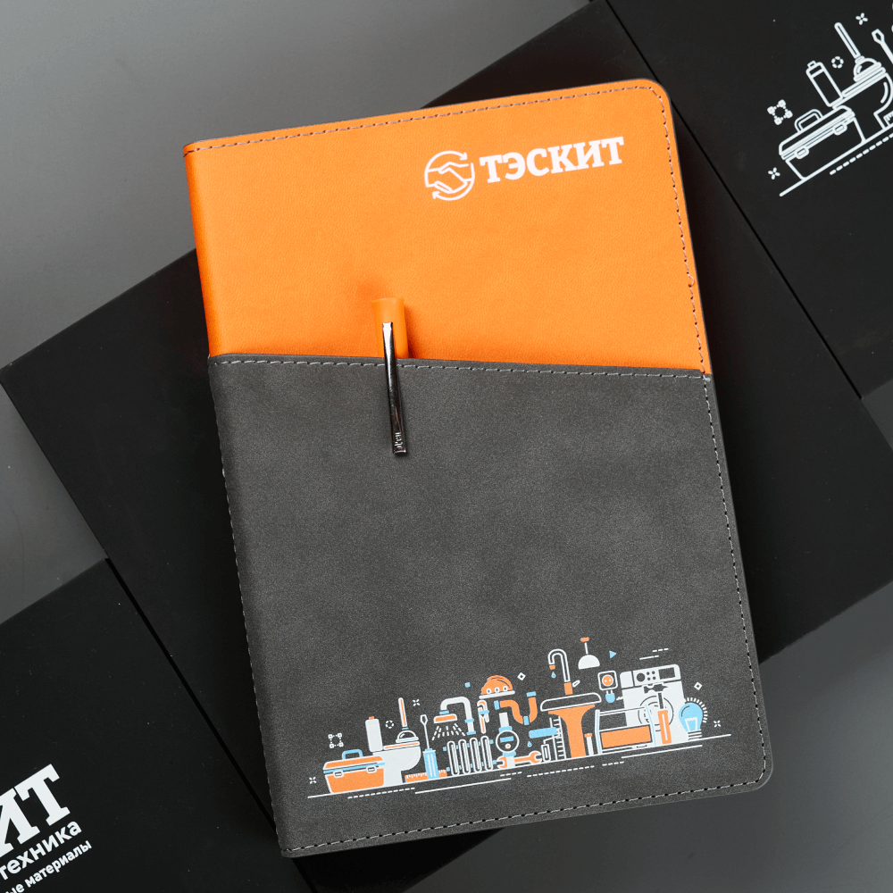 В кейсе представлены две модели недатированных ежедневников по 256 страниц. Контрастные серо-оранжевые элементы поддерживают фирменные цвета и подчеркивают детализированный принт с отраслевой графикой. В наличии есть модели ежедневников с внешним карманом для купюр, карт или пишущих принадлежностей, которые превращают привычный блокнот в удобный рабочий инструмент.