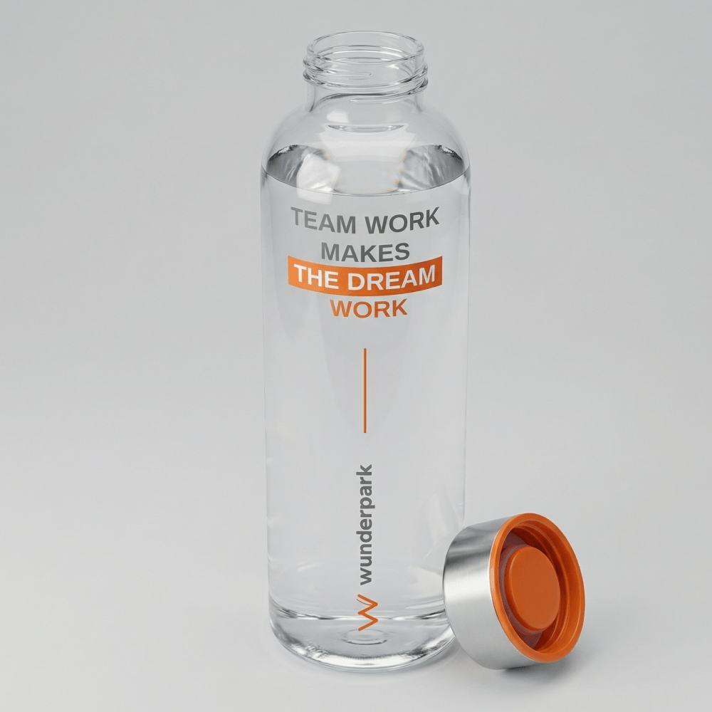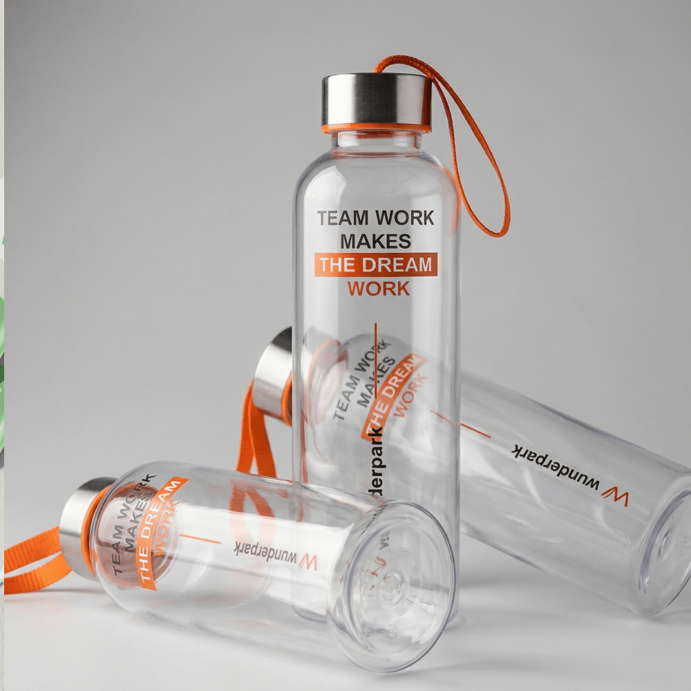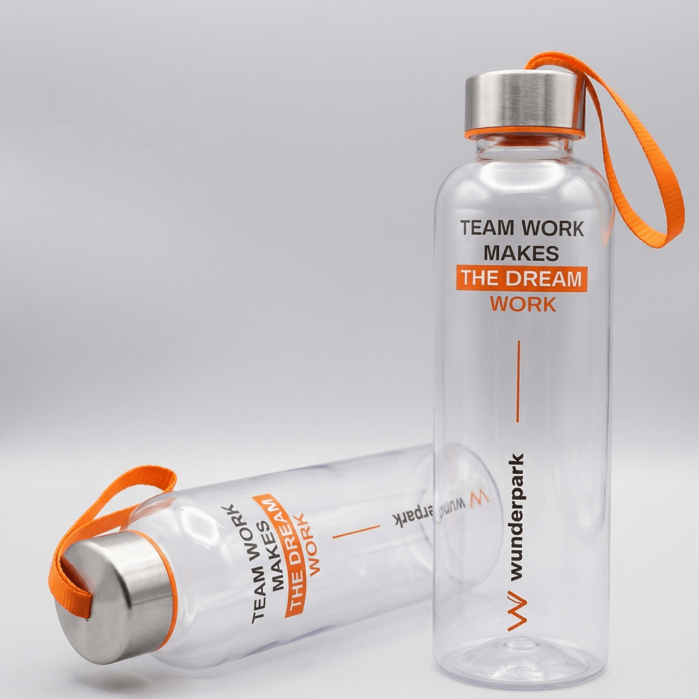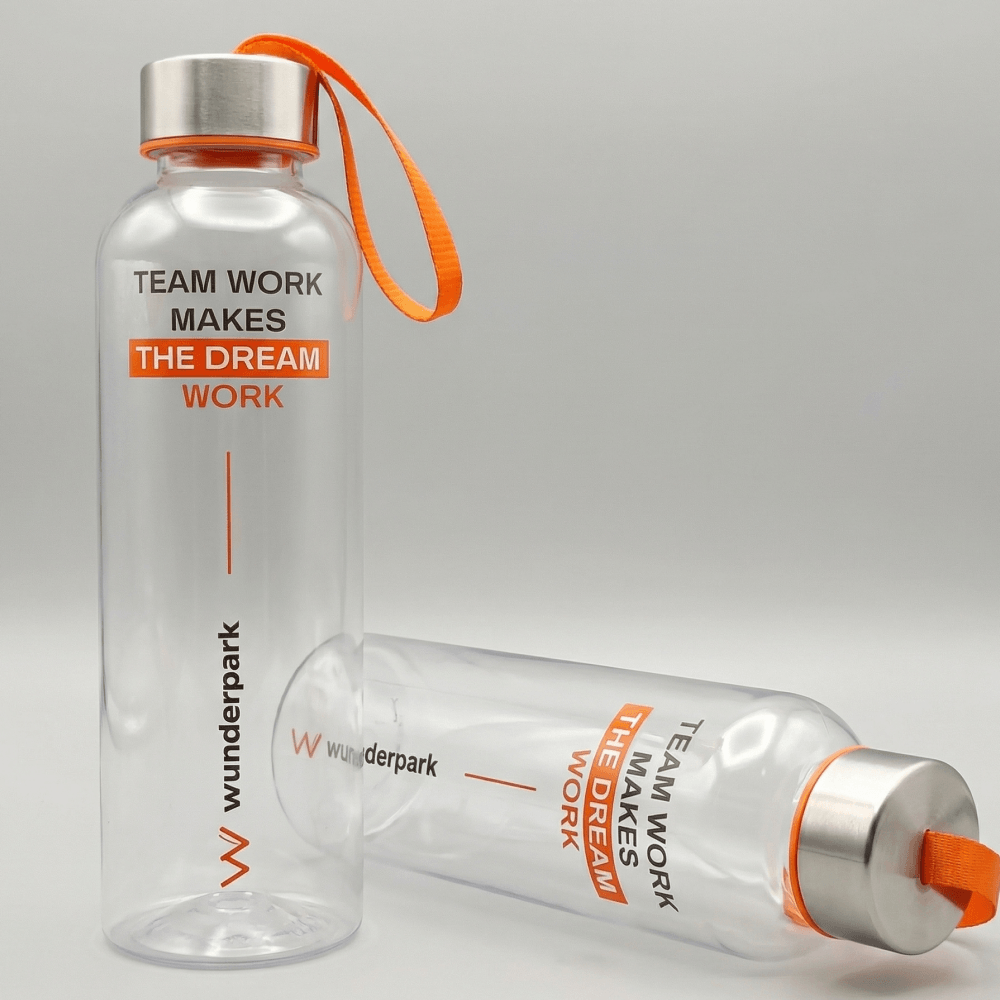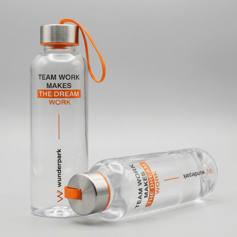 Для проекта Wunderpark мы подготовили брендированную бутылку для воды, которая стала частью единой welcome pack концепции для школы. Модель выполнена из тритана, имеет объем 450 мл и подходит для ежедневного использования в школе, на прогулке, в дороге и на занятиях. Материал легкий, прочный и безопасный, не содержит вредных примесей, поэтому отлично подходит для детских и подростковых наборов.