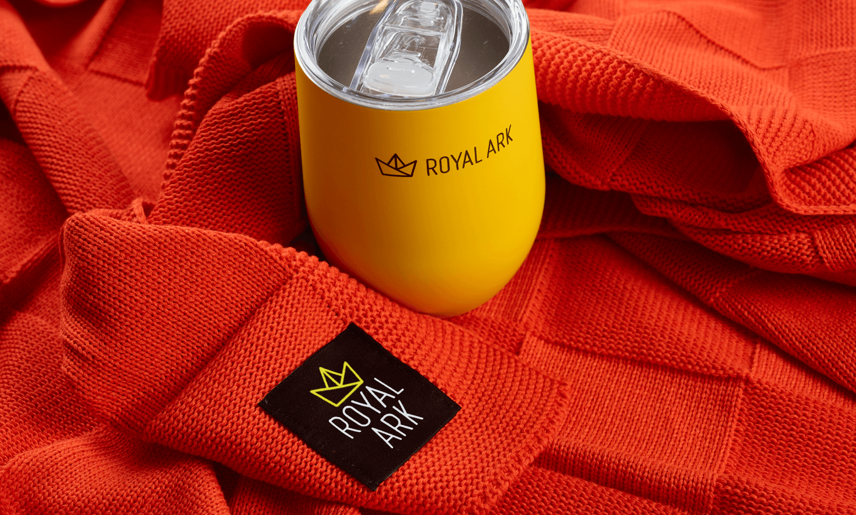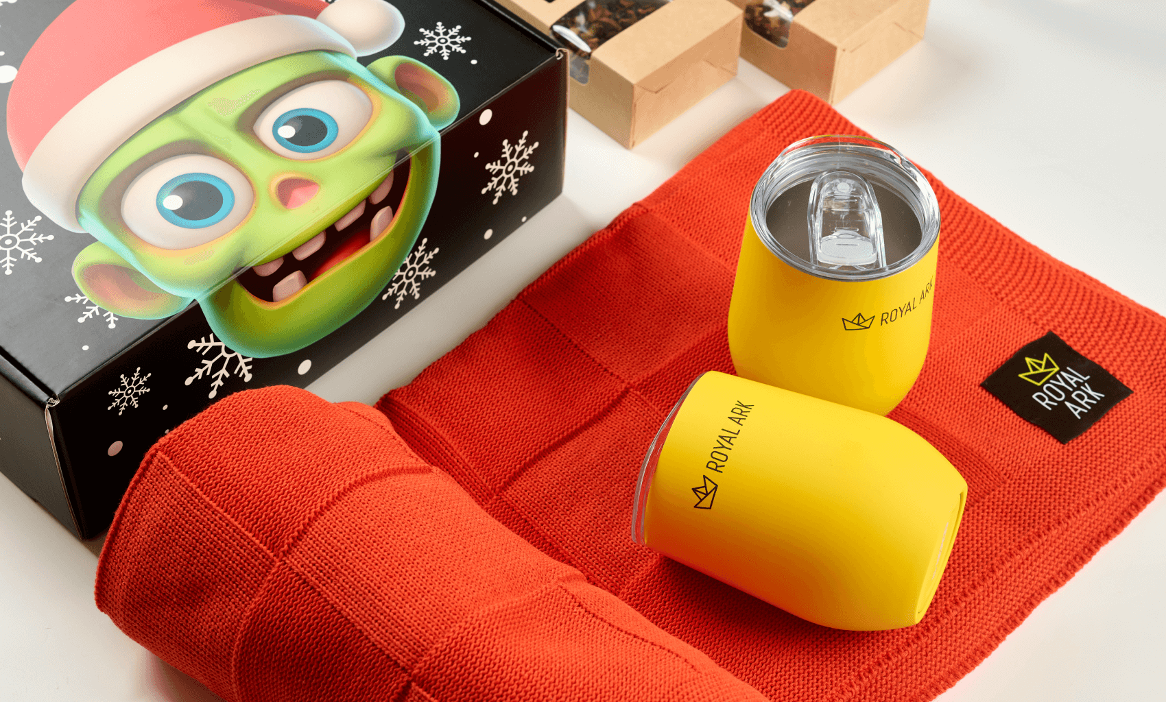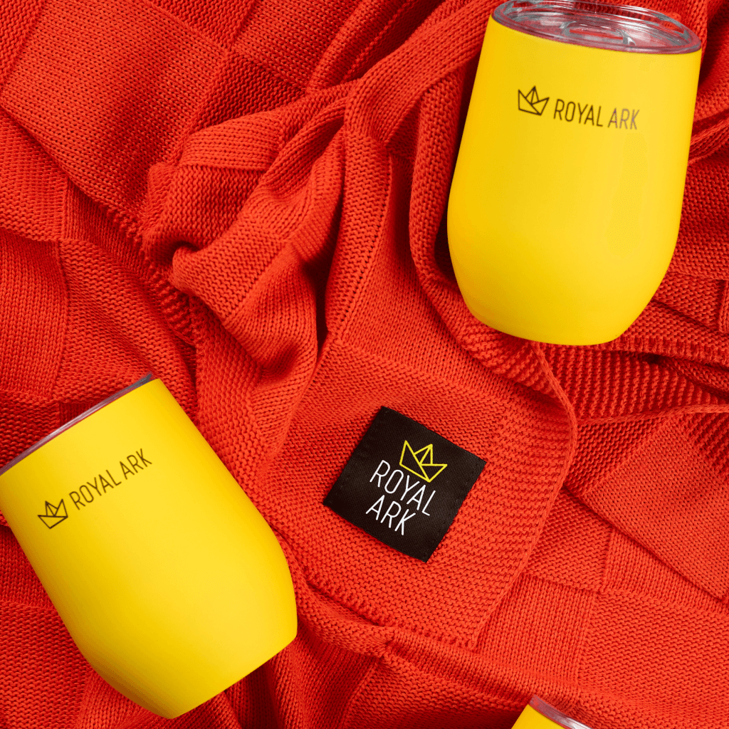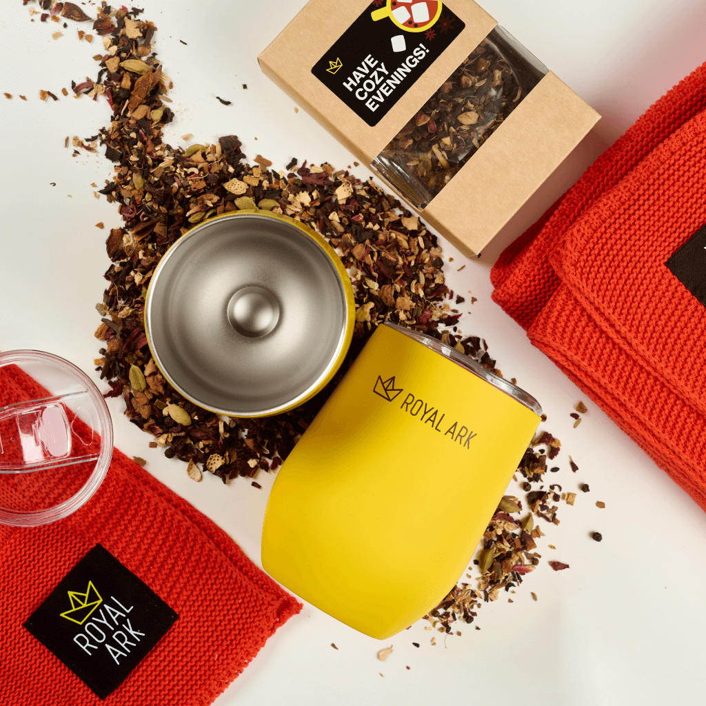 Наполнение набора мы собрали вокруг сценария теплого зимнего вечера. Яркий трикотажный плед с контрастным шевроном Royal Ark создает ощущение уюта и добавляет фирменный цвет в интерьер. Фруктовый чай на основе гибискуса с пряностями дополняет впечатление и дает понятный ритуал заботы о себе. Универсальная желтая термокружка Vacuum mug C1 с уф печатью логотипа сохраняет температуру напитка и становится ежедневным аксессуаром, который постоянно напоминает о бренде.