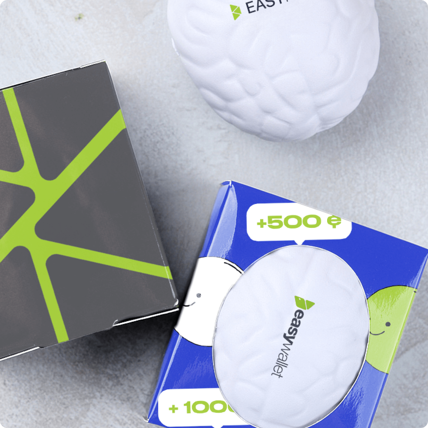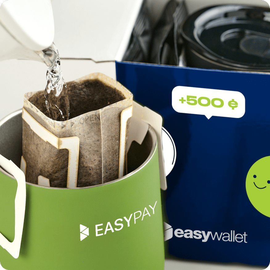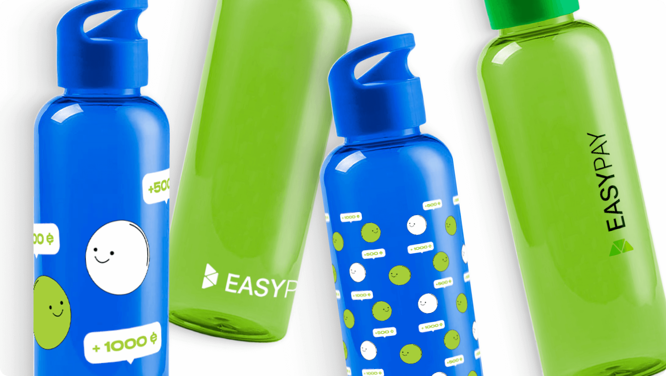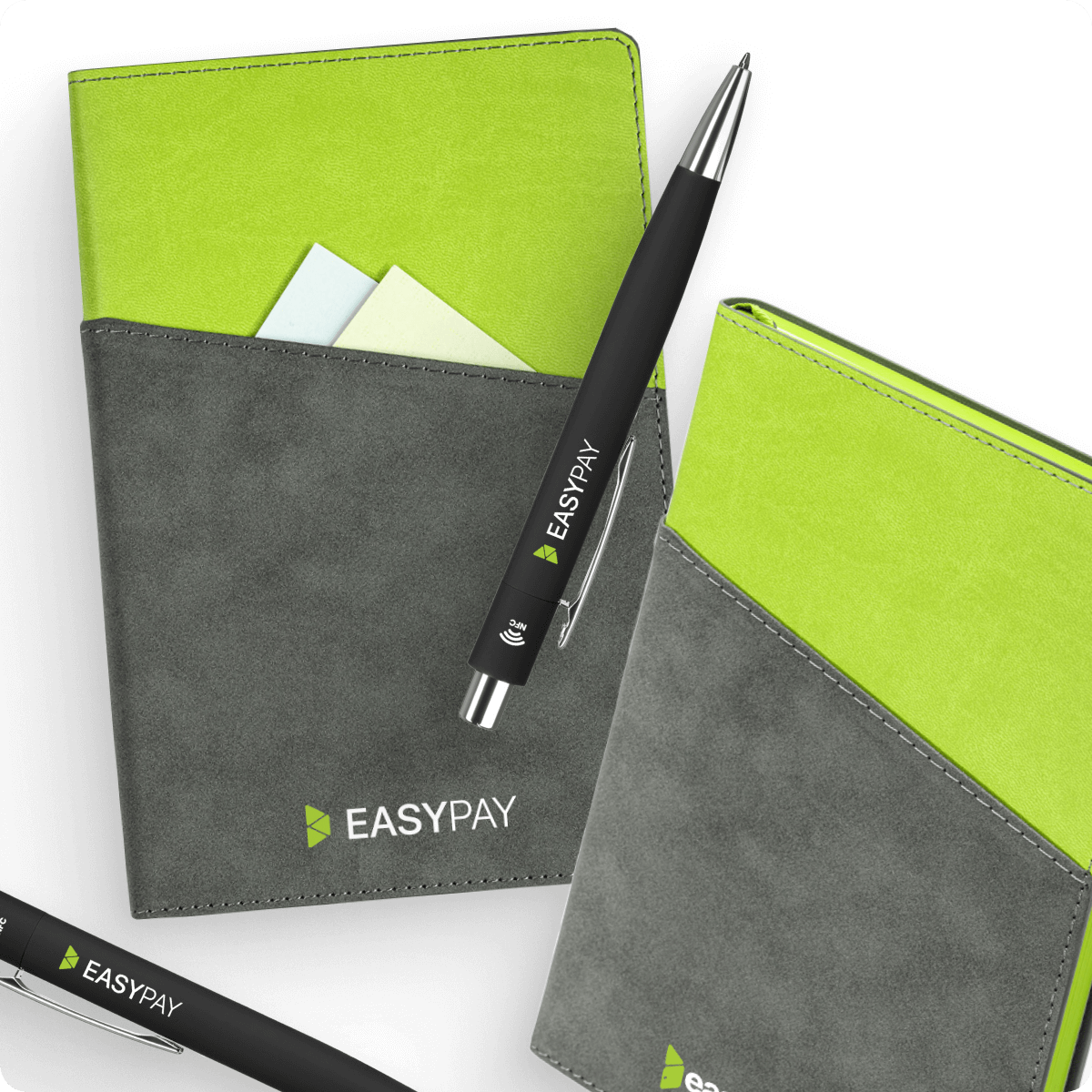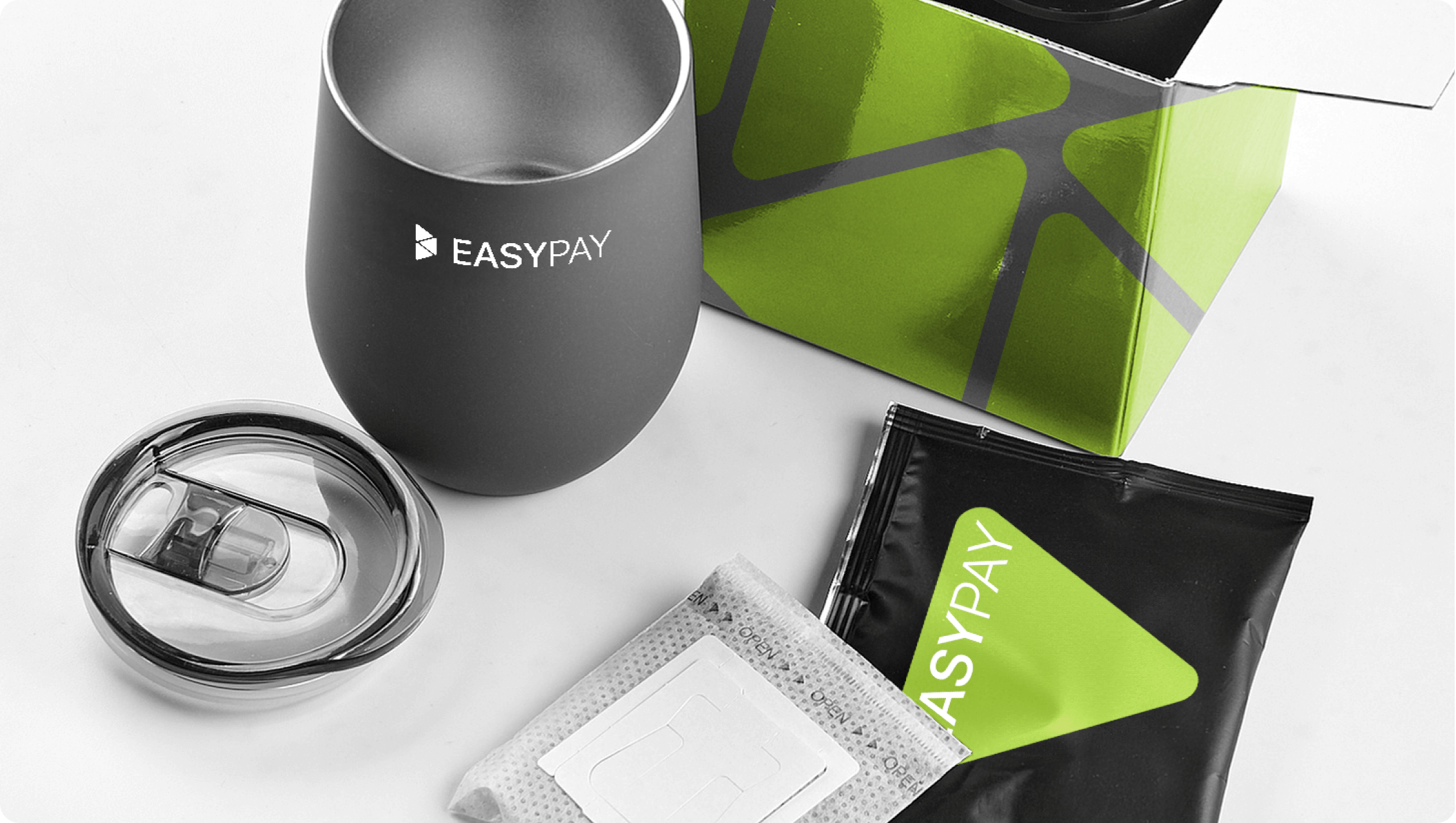 Welcome Pack для EasyPay от Impulse Media: термостакан, дрип-кофе, антистресс и блокнот. Папка органайзер объединяет все предметы в единое целое.