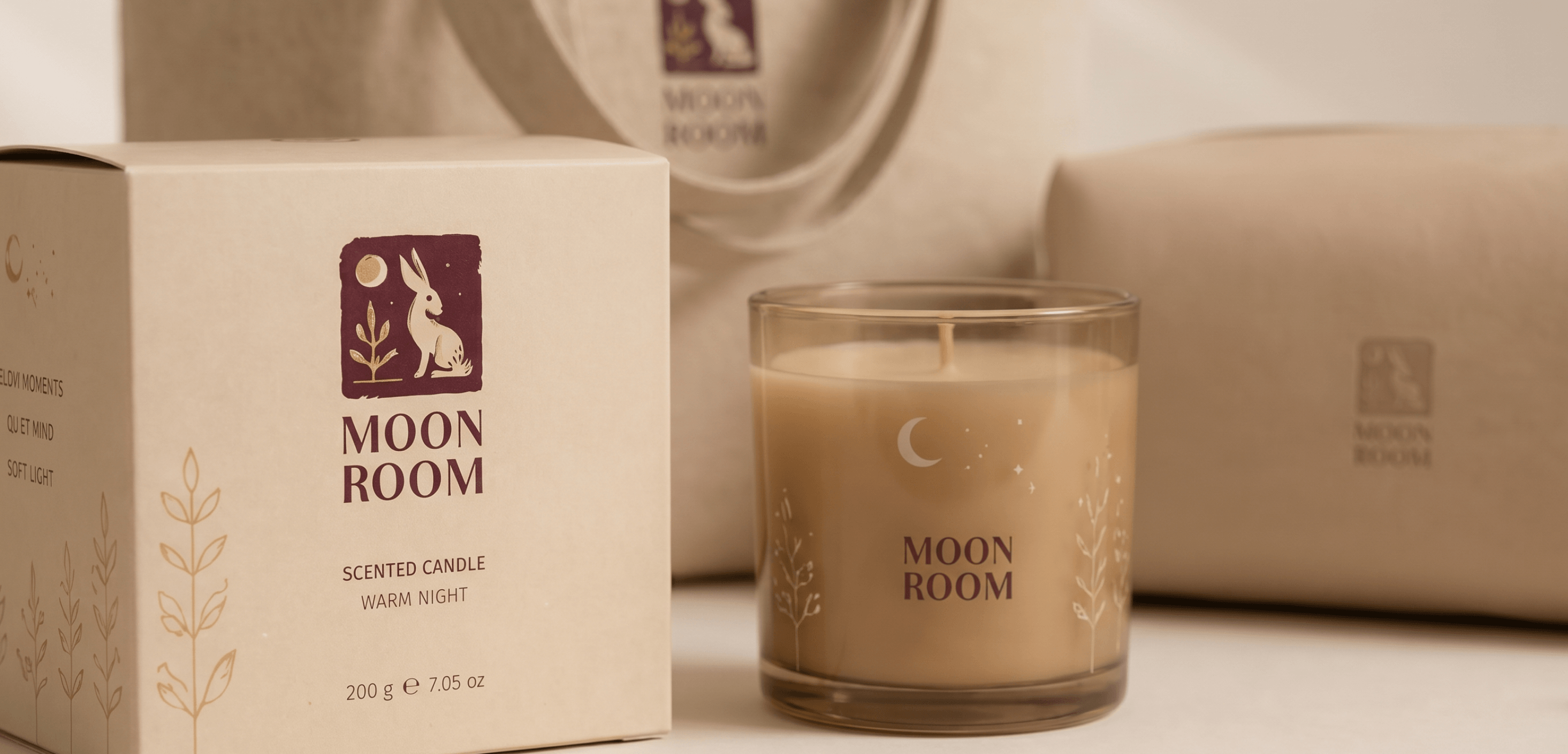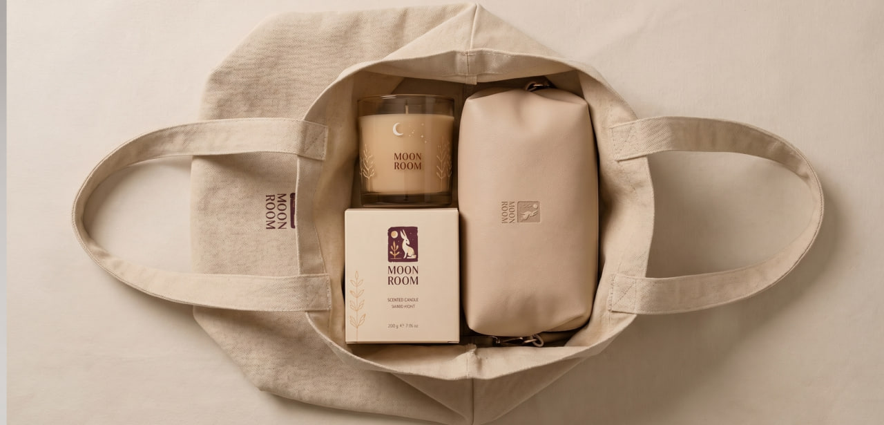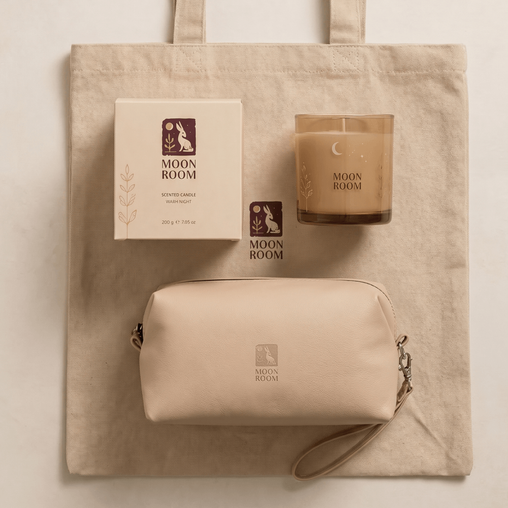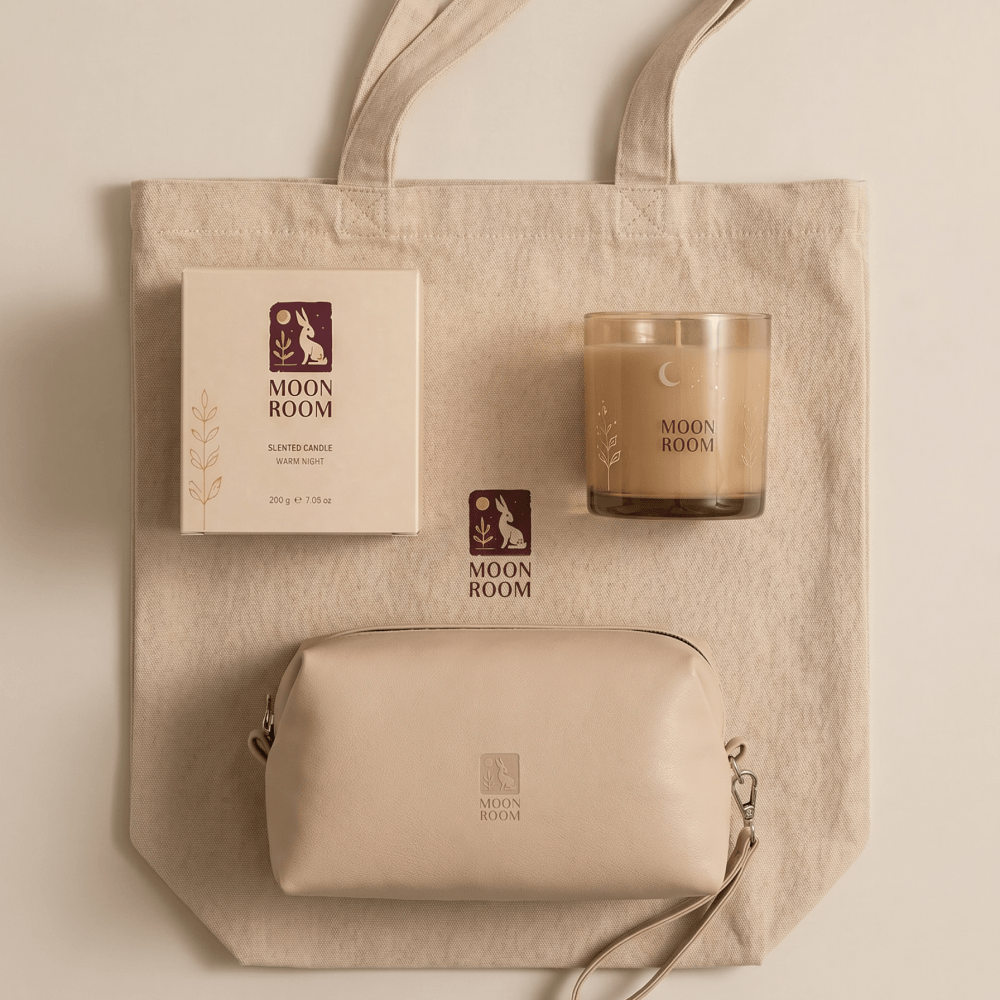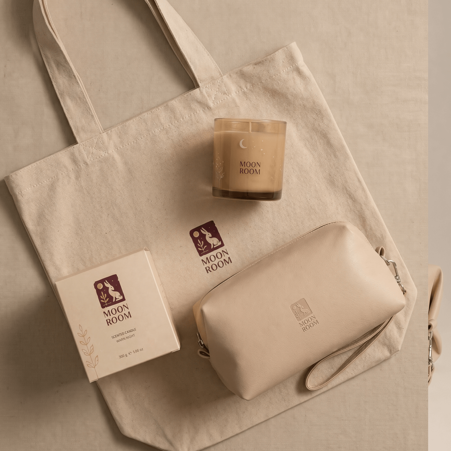 Кейс по созданию уютного брендированного набора для MOON ROOM. Включает хлопковый шоппер 340 г с шелкографией, эко-косметичку с тиснением и свечу в коробке.
