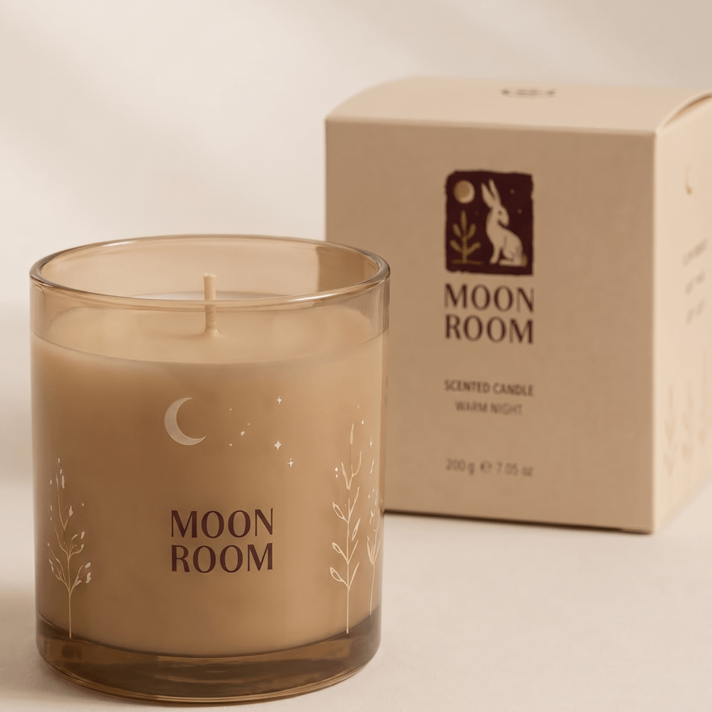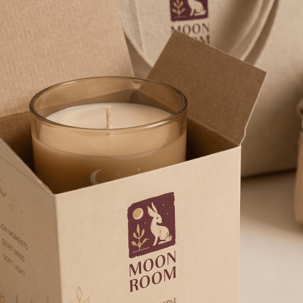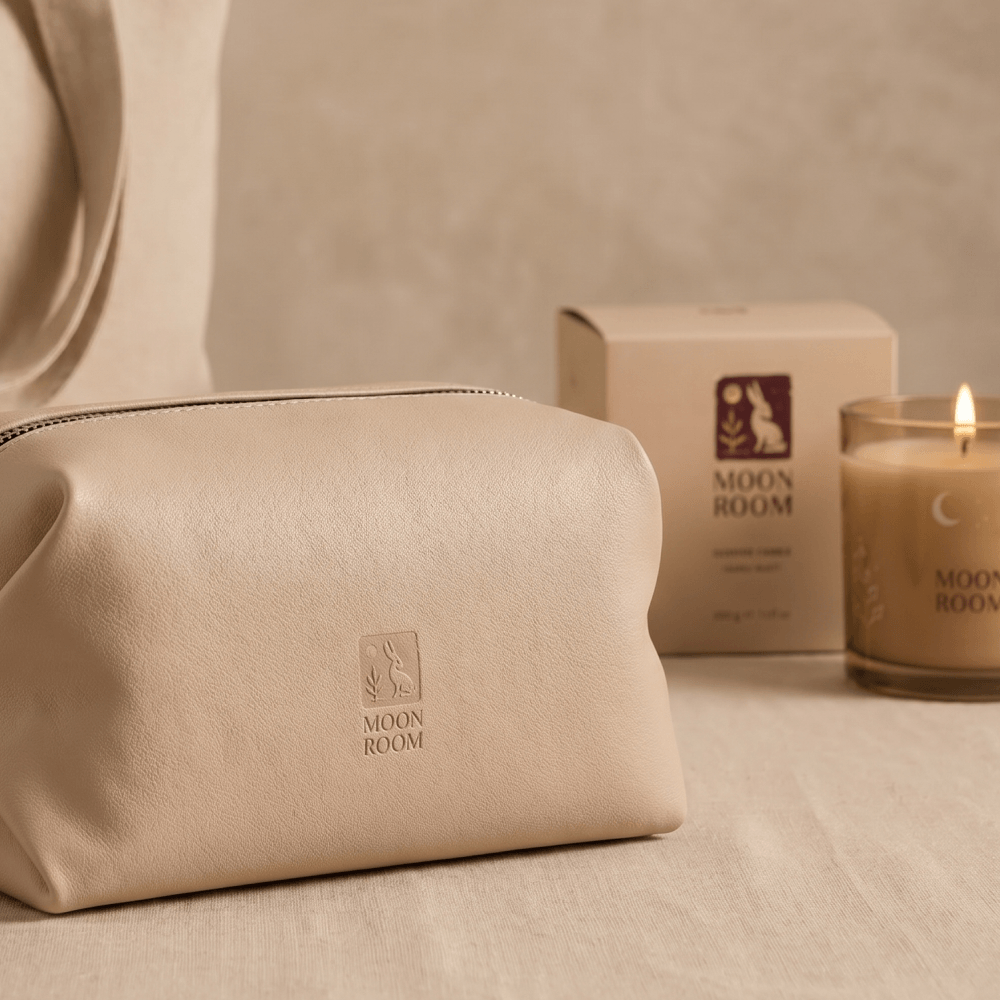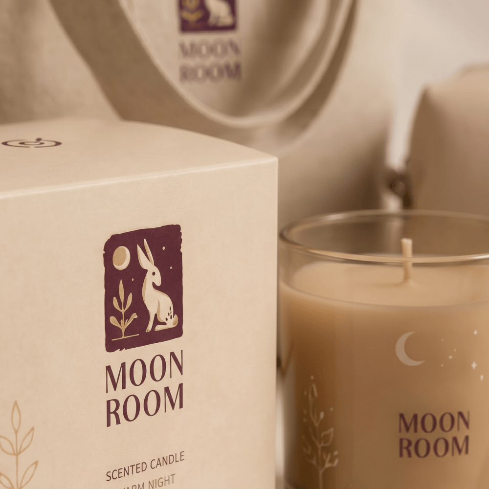 Кейс по созданию уютного брендированного набора для MOON ROOM. Включает хлопковый шоппер 340 г с шелкографией, эко-косметичку с тиснением и свечу в коробке.