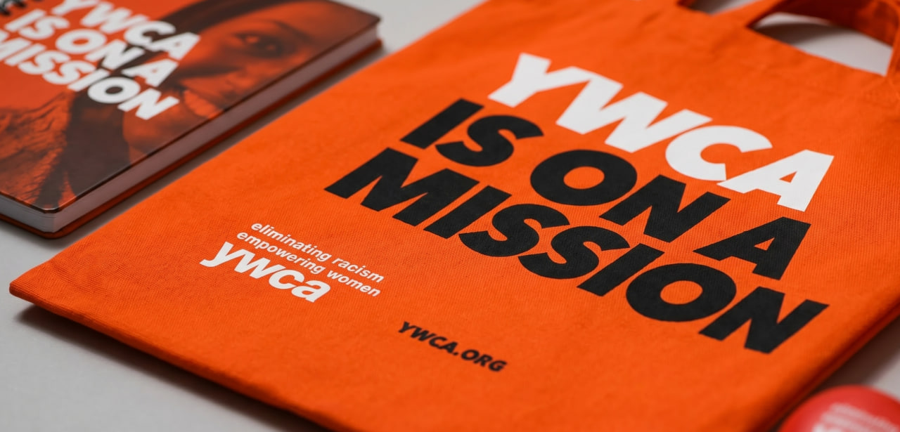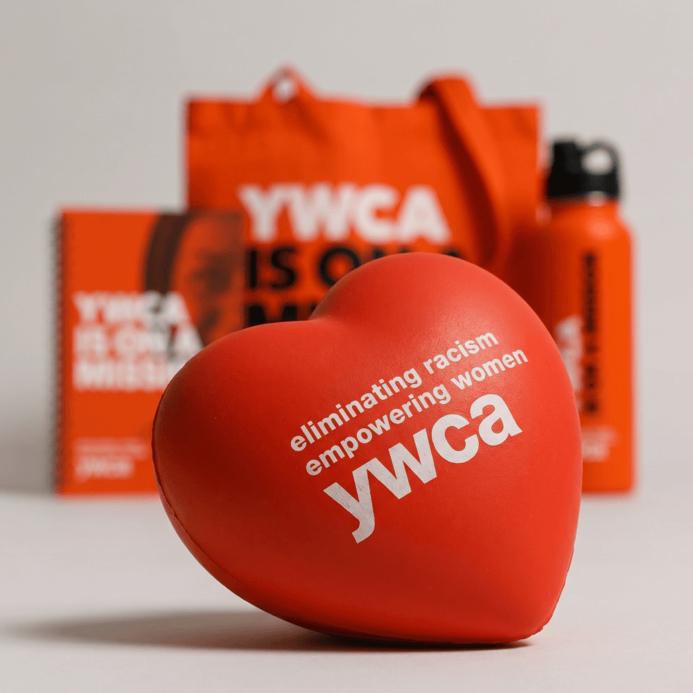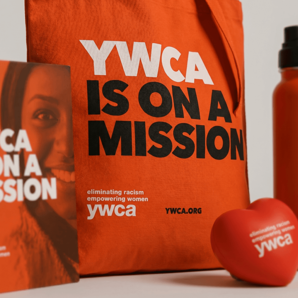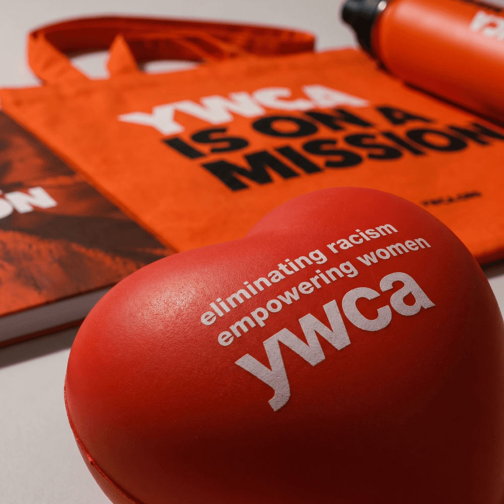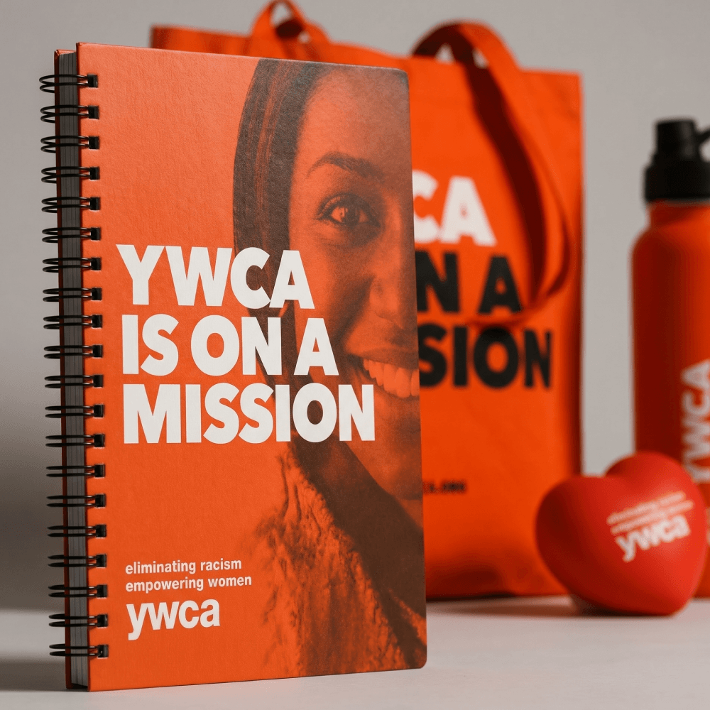 Капсульный мерч для YWCA: шоппер, бутылка, блокнот и антистресс с дизайном клиента. Качественная печать для социальной кампании и бренда НКО.