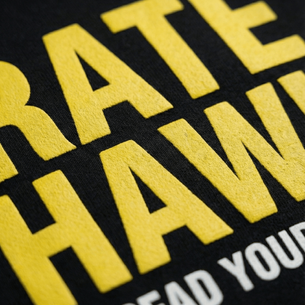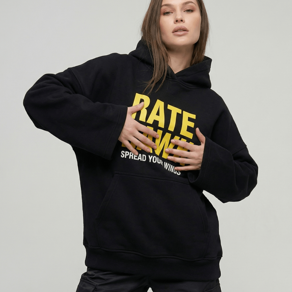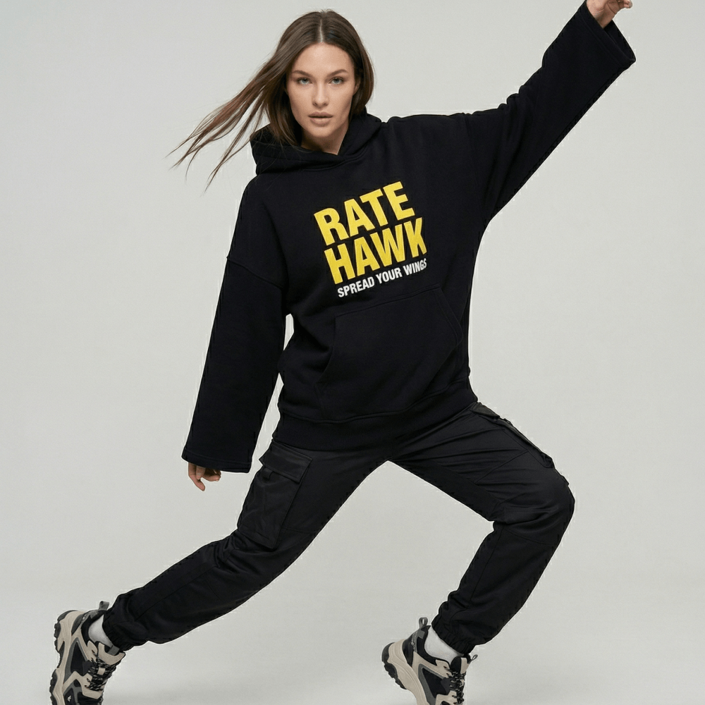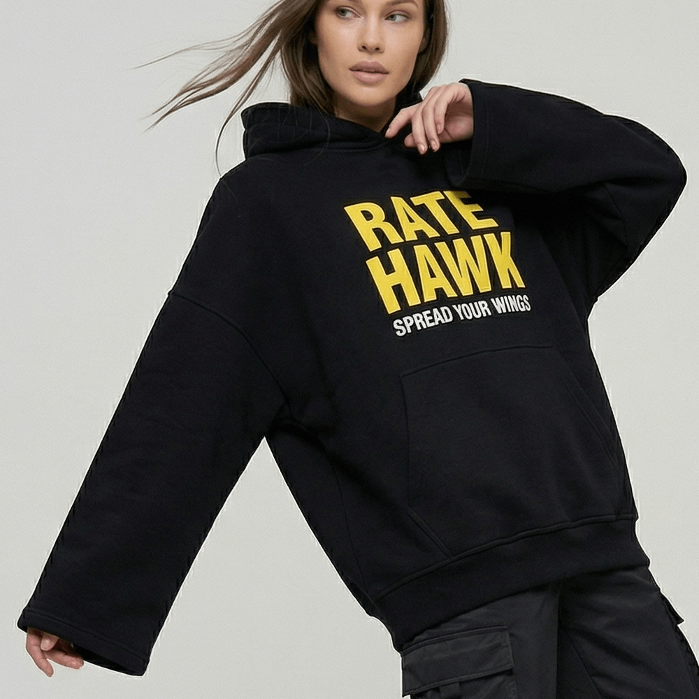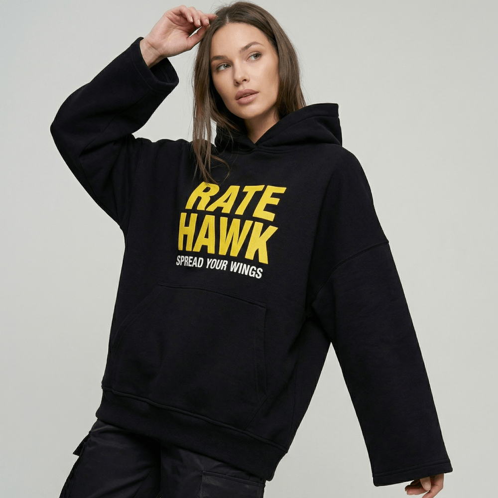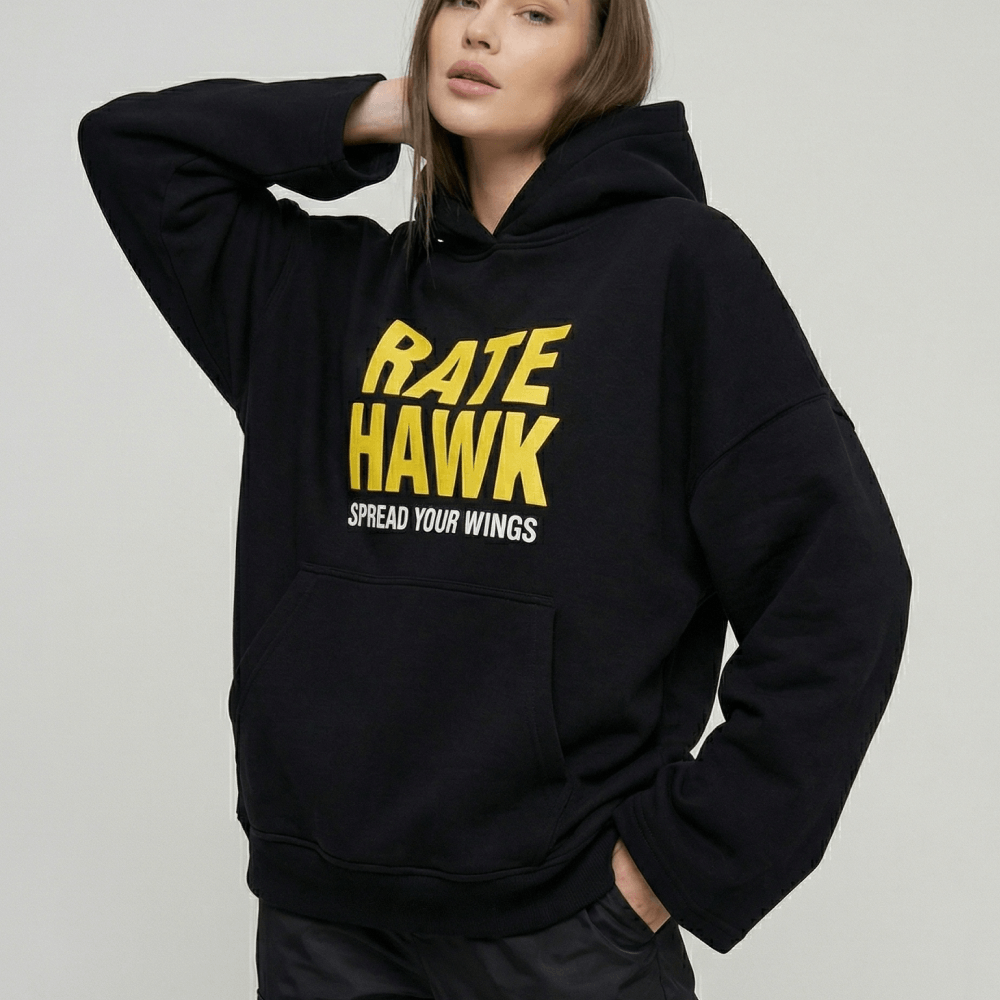 В fashion-мерче нельзя просто нанести логотип по центру. Важна грамотная интеграция бренда. Яркий желтый принт RateHawk и девиз Spread Your Wings круто контрастируют с черным фоном. Эта графика работает чисто и гармонично. В результате худи выглядит не как скучная униформа, а как полноценный дизайнерский стритвир для вашей жизни.