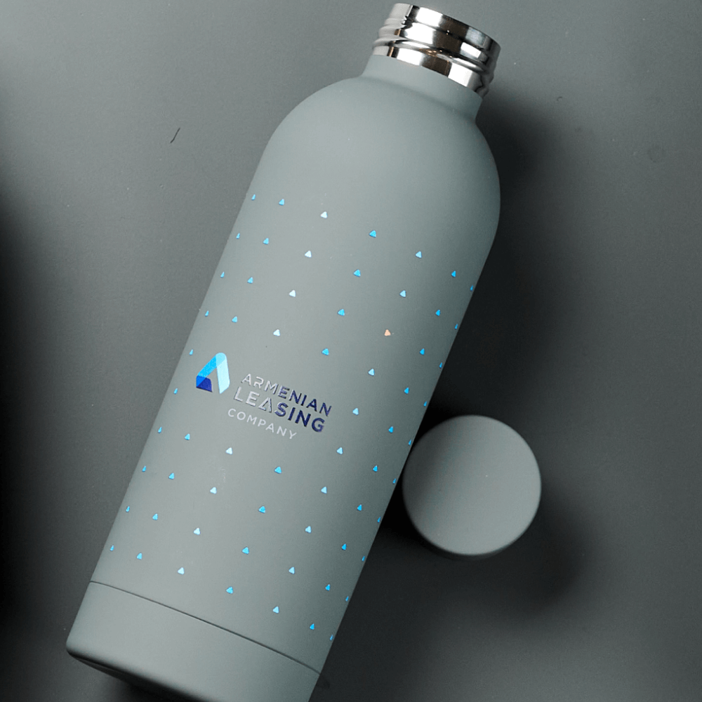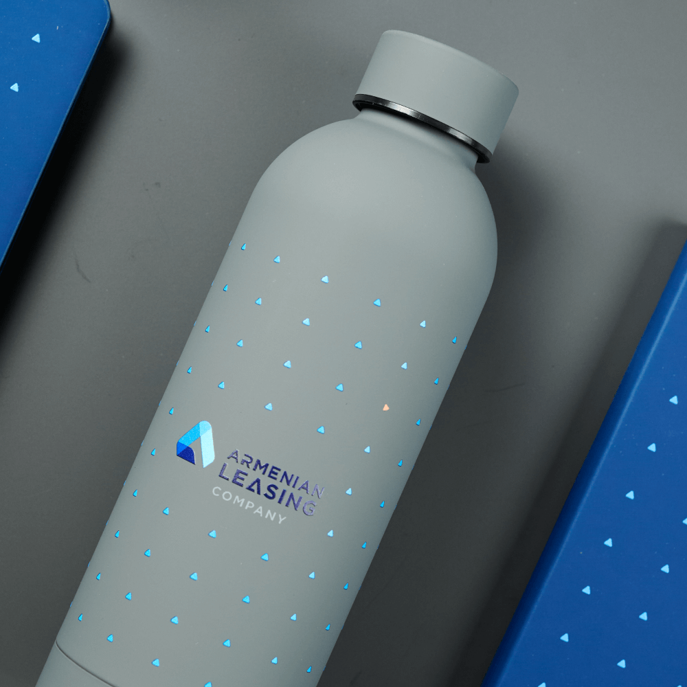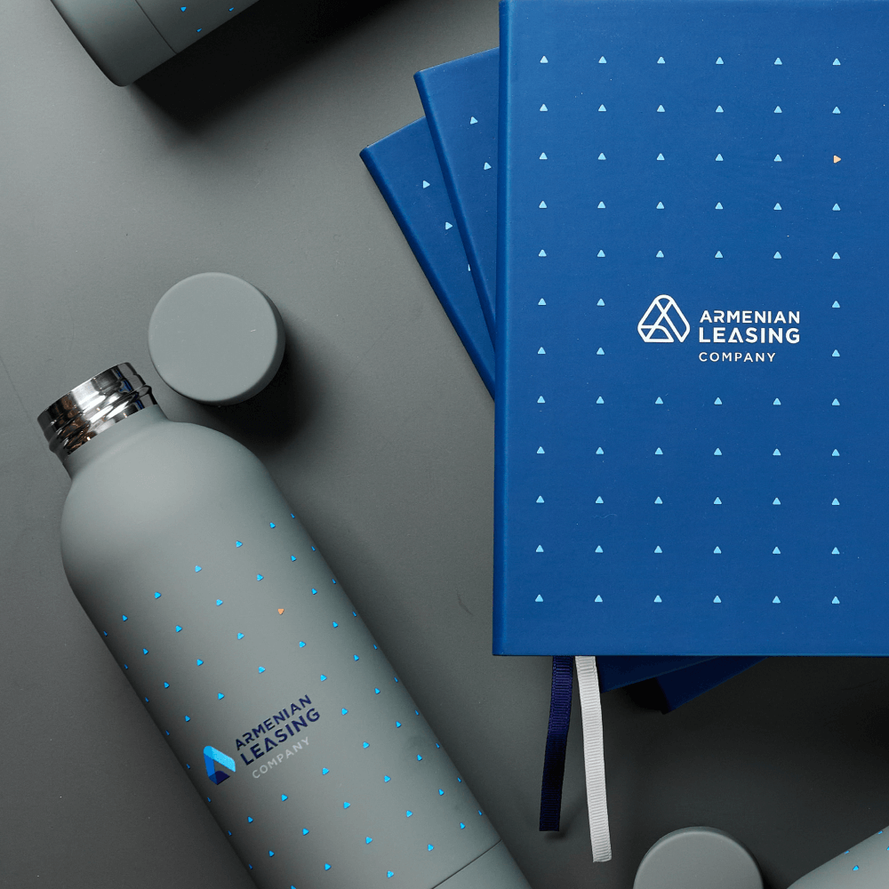 В работе над айдентикой ARMLeasing мы использовали технологию круговой УФ-печати. Это позволило нанести на корпус термобутылки не только логотип, но и сложный фирменный паттерн по всей окружности. На обложке ежедневника также выполнена УФ-печать, которая на покрытии софт-тач выглядит объемно и контрастно. Сочетание глубоких цветов и четких линий паттерна усиливает узнаваемость бренда и превращает стандартные аксессуары в дизайнерские объекты. Такие технологии от Impulse Media обеспечивают долговечность принтов и делают каждый подарок тактильно дорогим и визуально статусным для получателя.