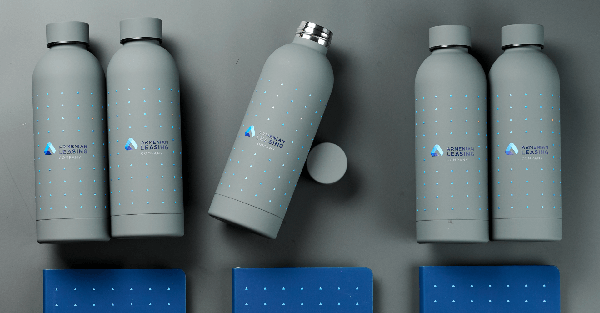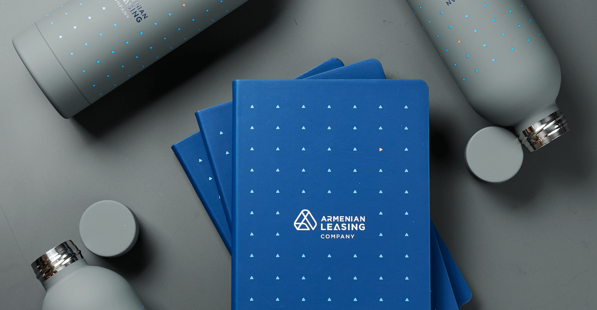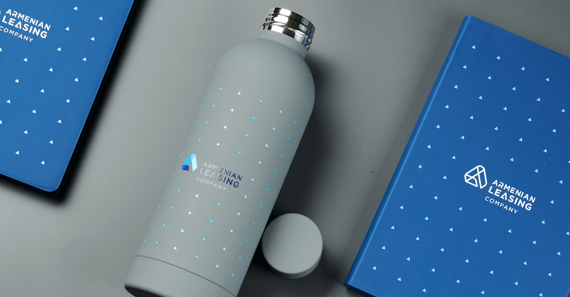 В работе над айдентикой ARMLeasing мы использовали технологию круговой УФ-печати. Это позволило нанести на корпус термобутылки не только логотип, но и сложный фирменный паттерн по всей окружности. На обложке ежедневника также выполнена УФ-печать, которая на покрытии софт-тач выглядит объемно и контрастно. Сочетание глубоких цветов и четких линий паттерна усиливает узнаваемость бренда и превращает стандартные аксессуары в дизайнерские объекты. Такие технологии от Impulse Media обеспечивают долговечность принтов и делают каждый подарок тактильно дорогим и визуально статусным для получателя.