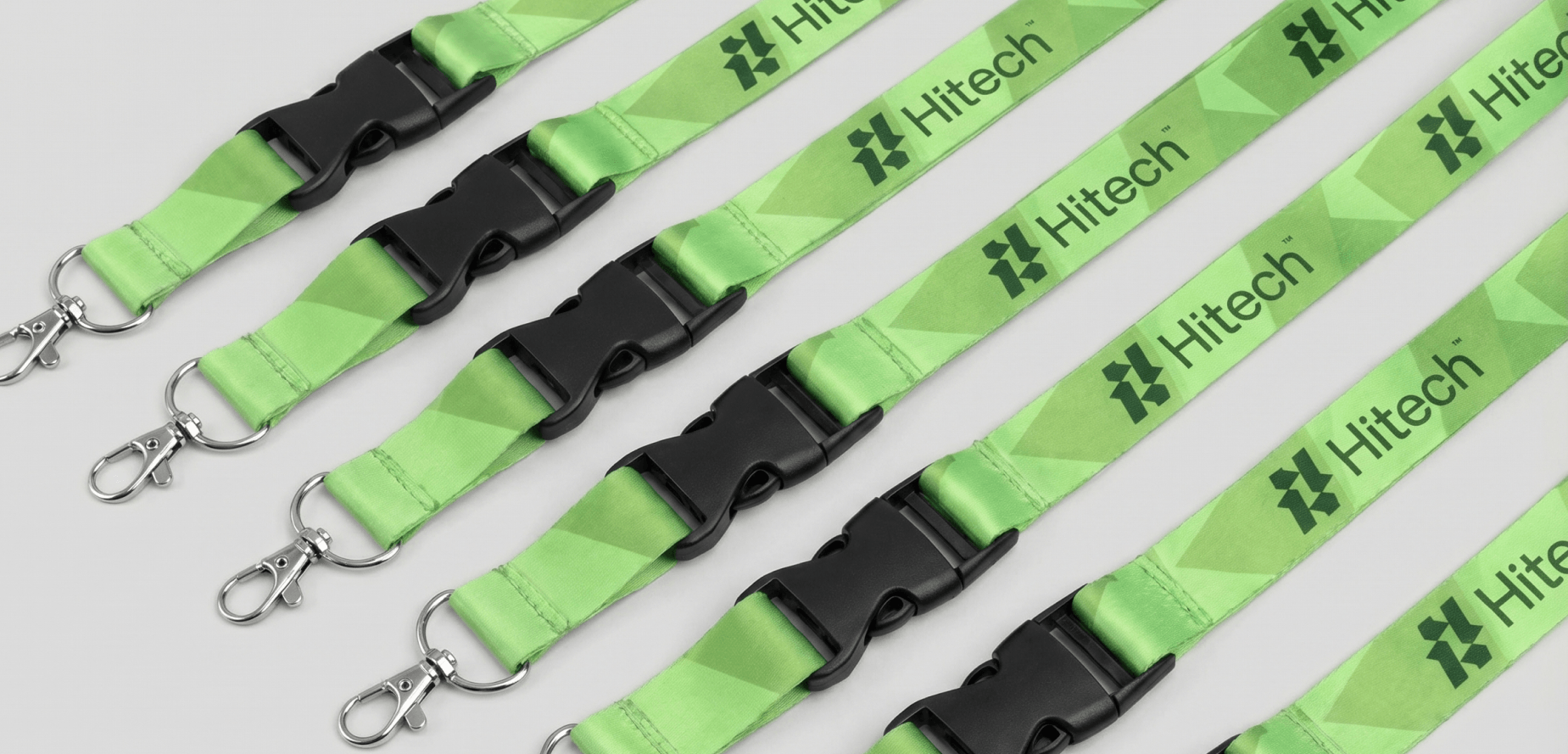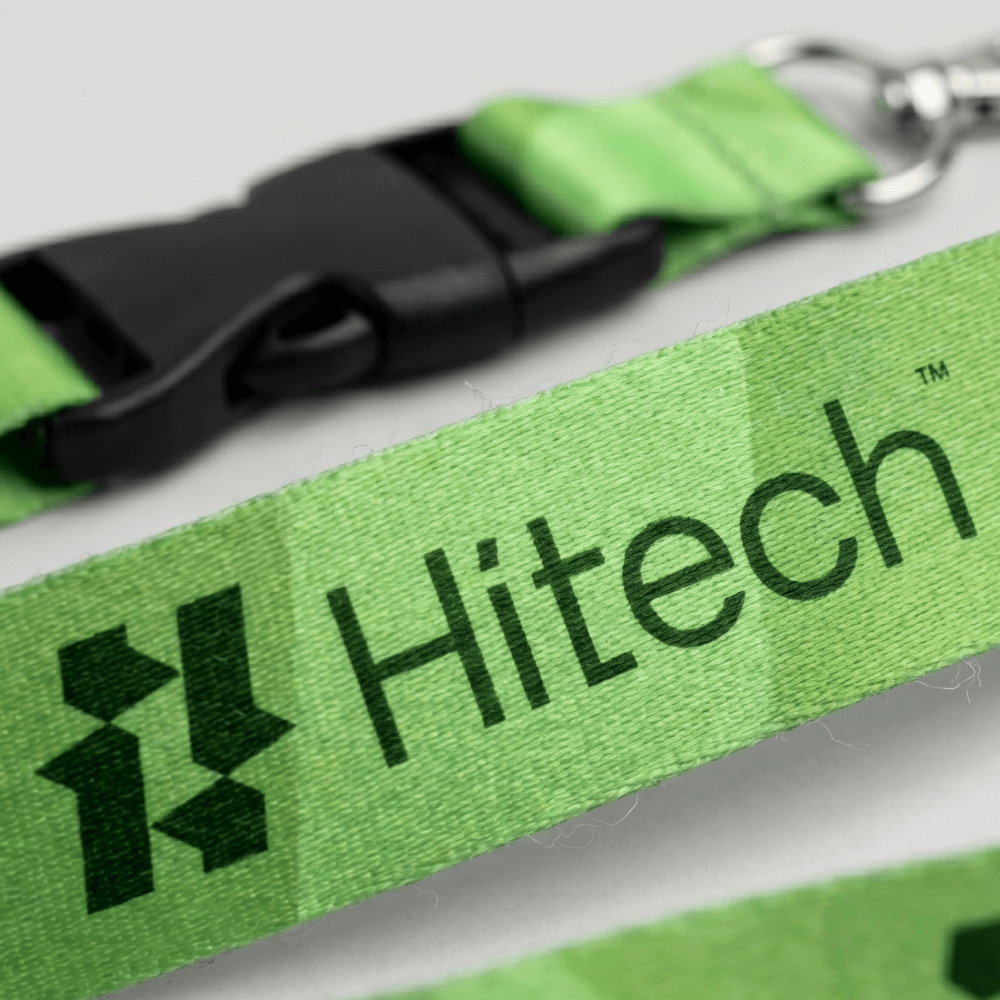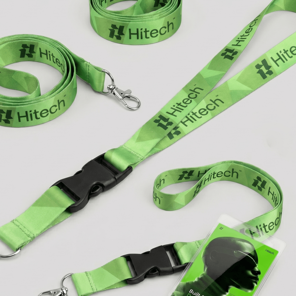 Для Hitech мы разработали яркие фирменные ленты для бейджей, которые сразу работают как элемент навигации, безопасности и визуальной идентификации бренда. Основой проекта стала лента шириной 25 мм с полноцветной сублимационной печатью с двух сторон. Такой формат дает насыщенный цвет, чистую передачу логотипа и аккуратный повтор фирменной графики по всей длине изделия.