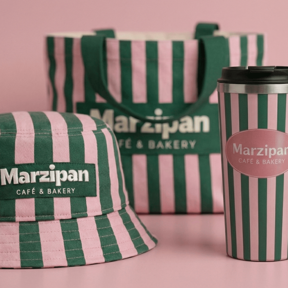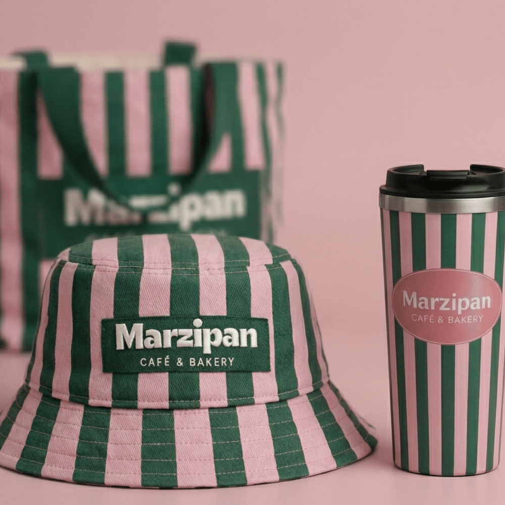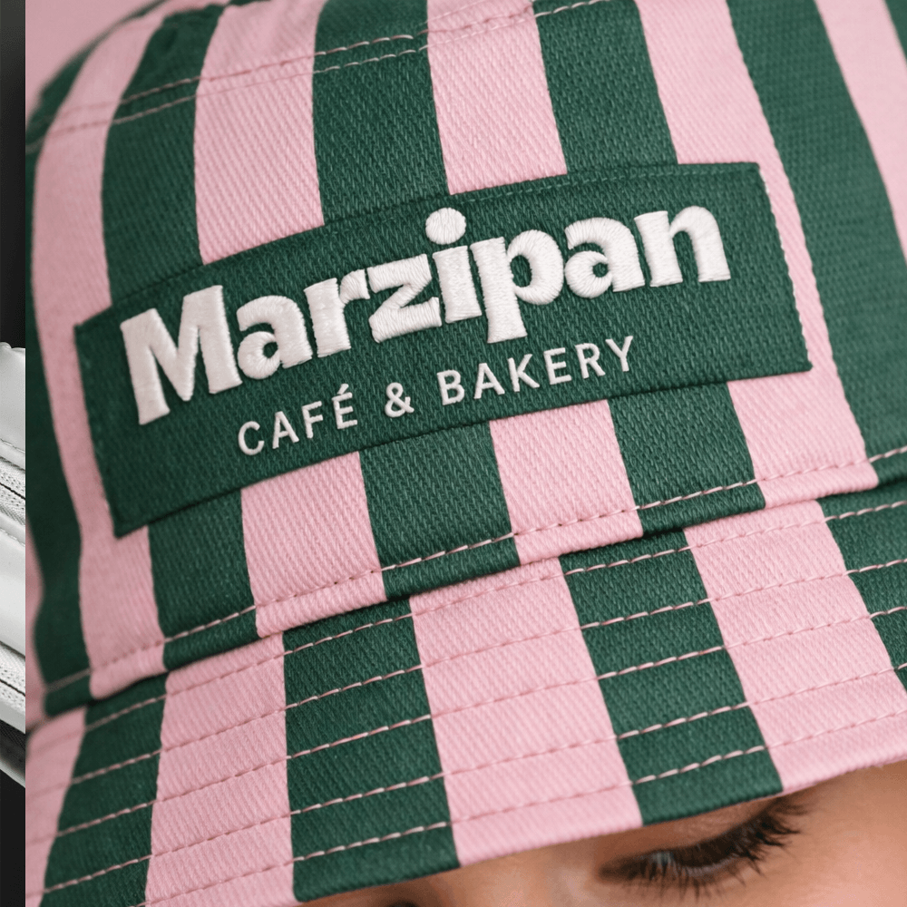 Панамы для Marzipan Café созданы как модный мерч на заказ с дизайном, который хочется носить каждый день. Это не стандартный сувенир, а полноценный аксессуар для merch shop, который усиливает визуальный стиль бренда и работает на узнаваемость кафе вне точки продаж.