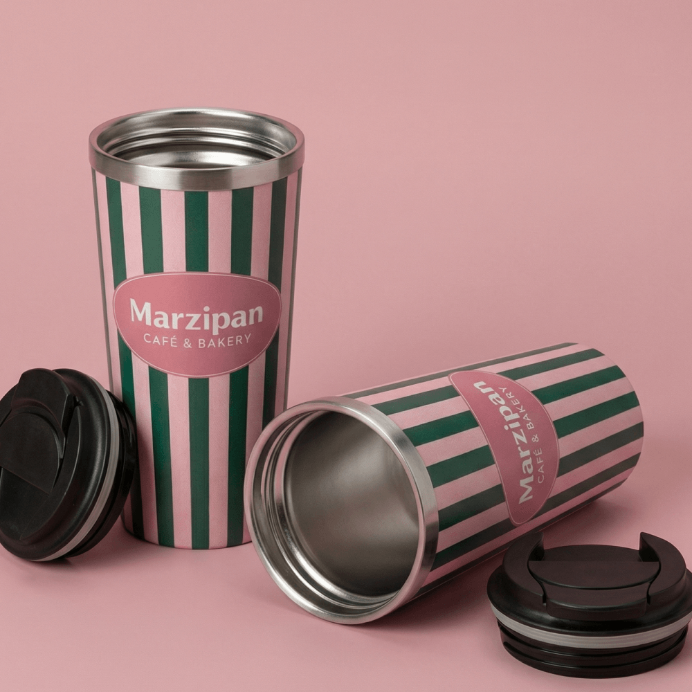 Термокружки Marzipan Café созданы как полезный мерч для кафе, который ежедневно работает на бренд. Это удобный аксессуар для кофе с собой, прогулок и офиса, который сочетает качественные материалы, современный внешний вид и фирменный дизайн в единой концепции merch shop.