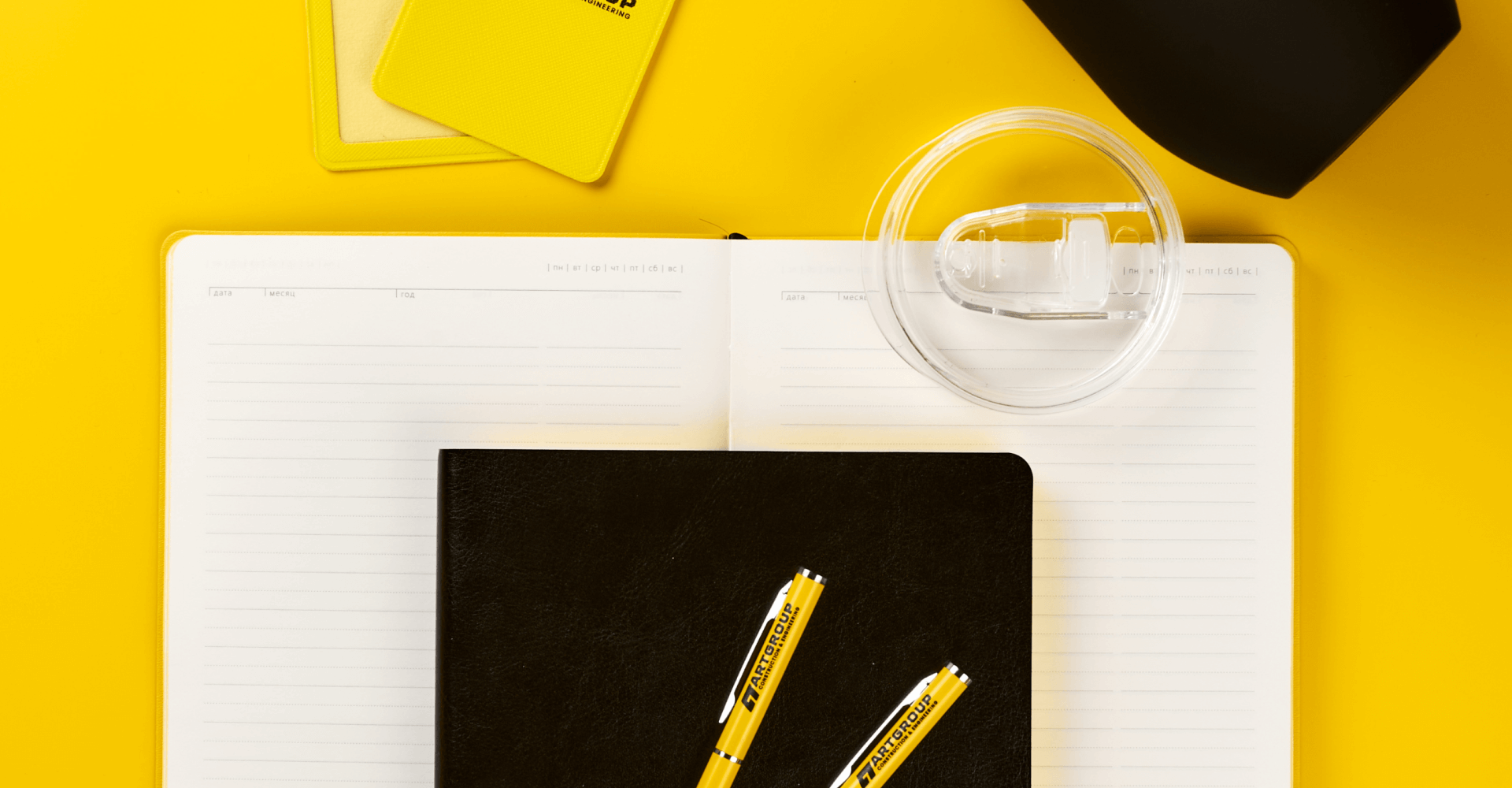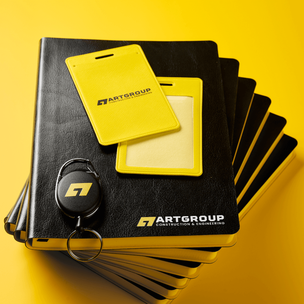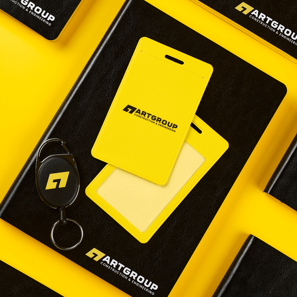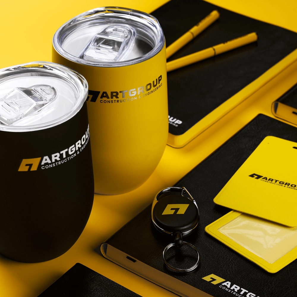 Офисный набор с корпоративным мерчем включает кружку Bright Tulip, термокружку Step Soft 370 мл, ежедневник Doppio, шариковую ручку Hotel Chrome, чехол для пропуска Devon и ретрактор Access New. Все товары оформлены в единой черно-желтой палитре с логотипом компании. Брендинг выполнен уф печатью на ежедневнике, ручках и аксессуарах для пропуска, а на термокружке нанесена круговая гравировка логотипа.