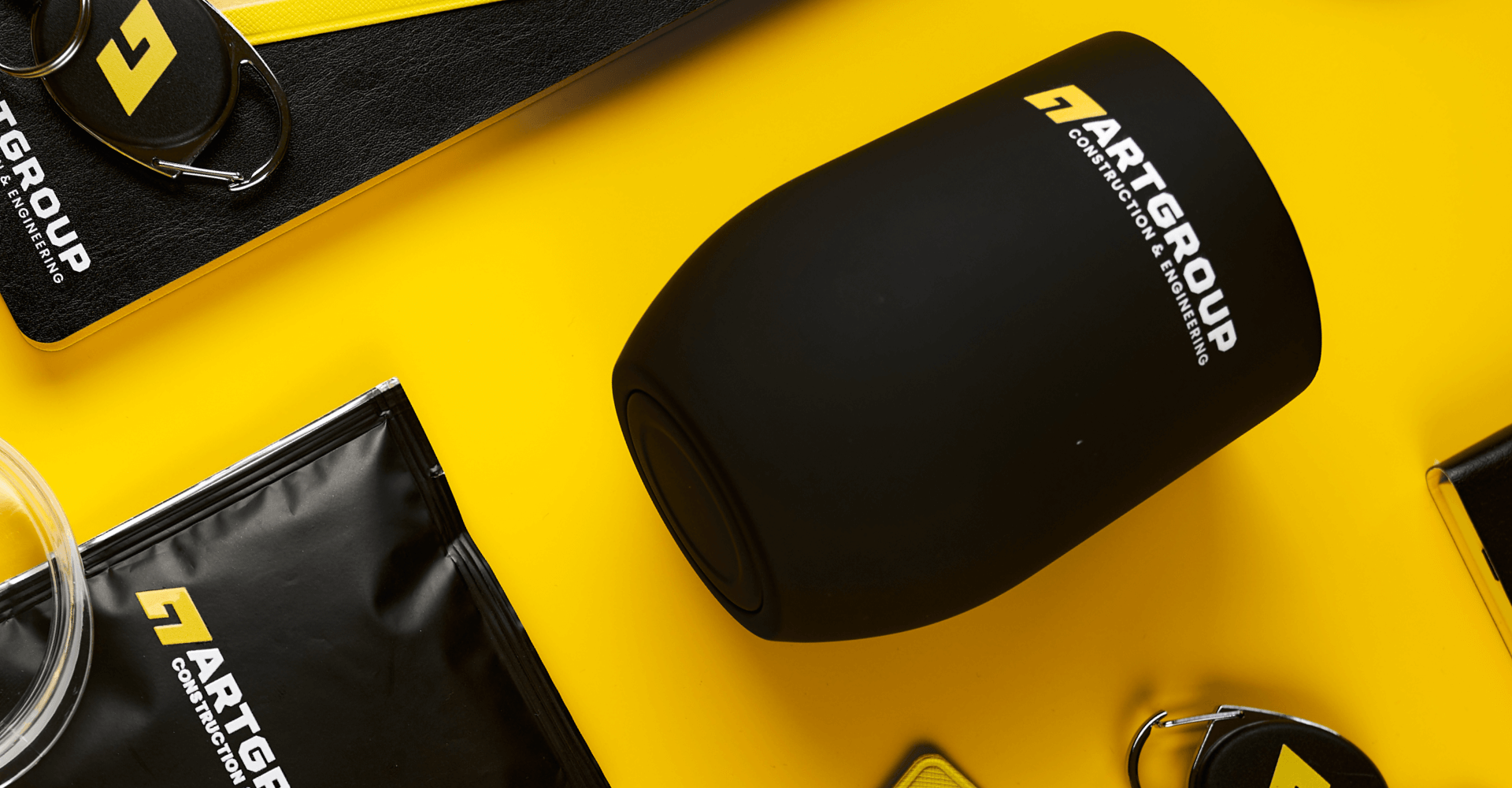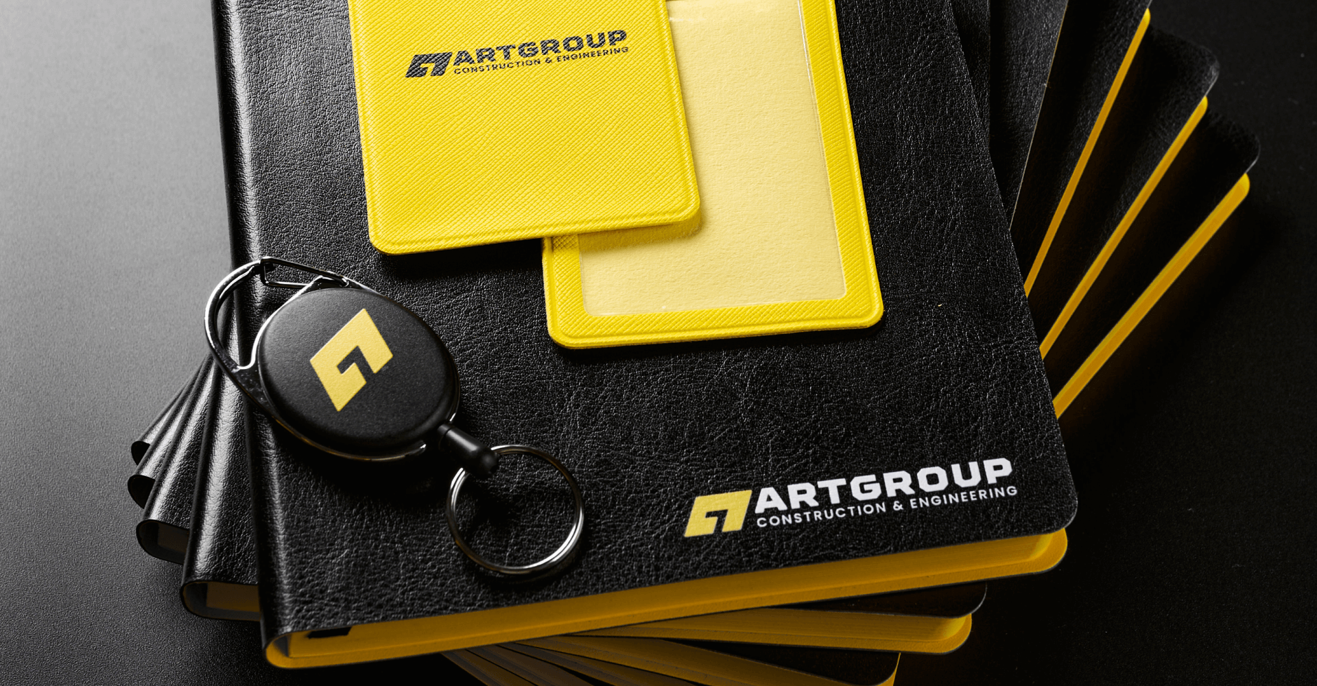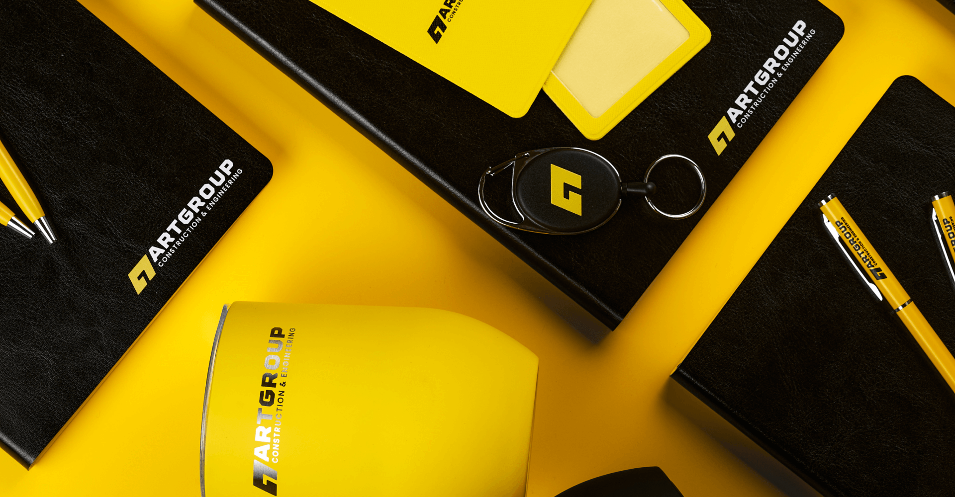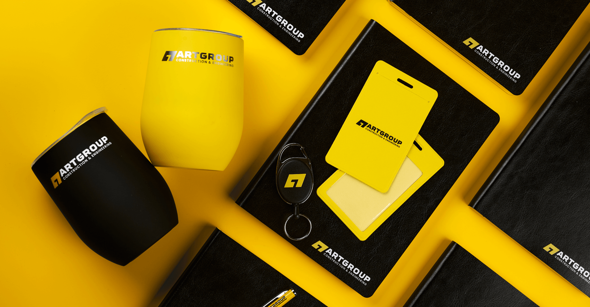Офисный набор с корпоративным мерчем включает кружку Bright Tulip, термокружку Step Soft 370 мл, ежедневник Doppio, шариковую ручку Hotel Chrome, чехол для пропуска Devon и ретрактор Access New. Все товары оформлены в единой черно-желтой палитре с логотипом компании. Брендинг выполнен уф печатью на ежедневнике, ручках и аксессуарах для пропуска, а на термокружке нанесена круговая гравировка логотипа.