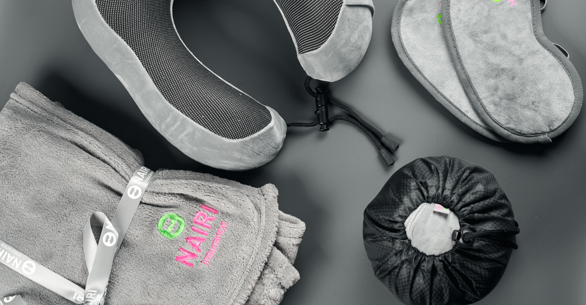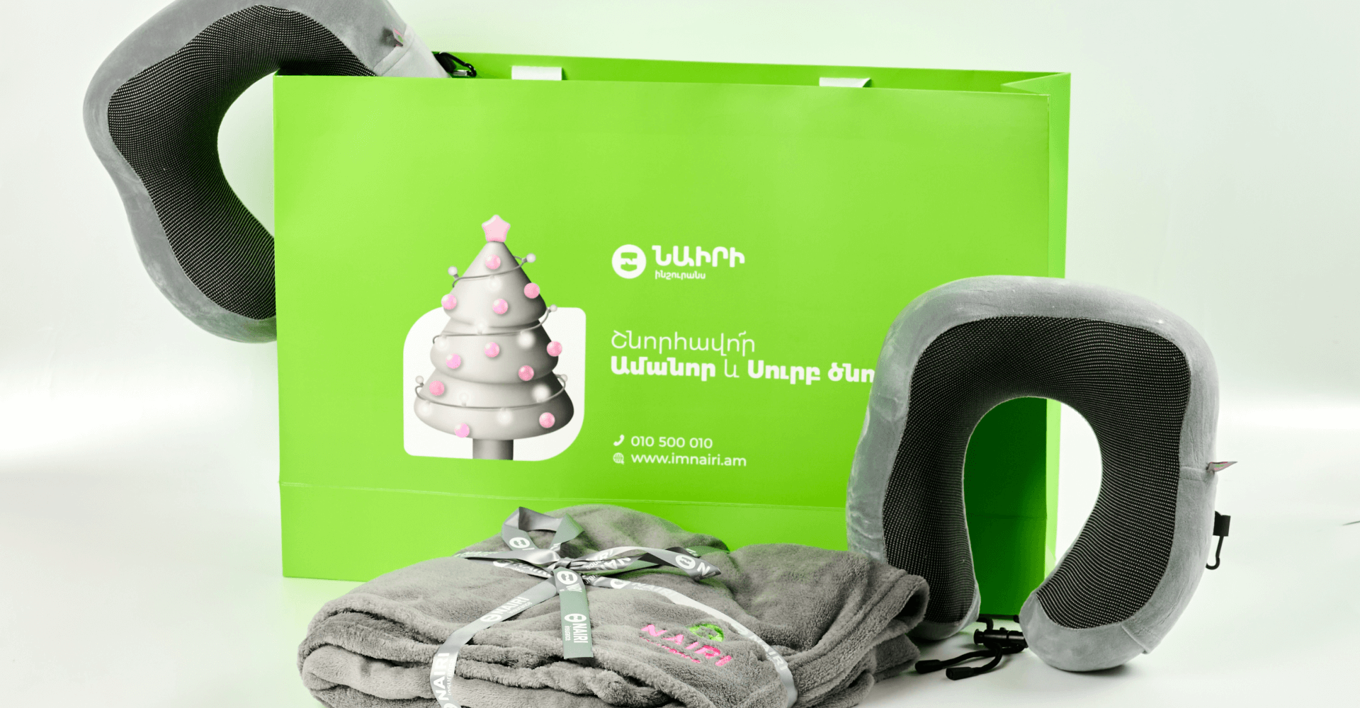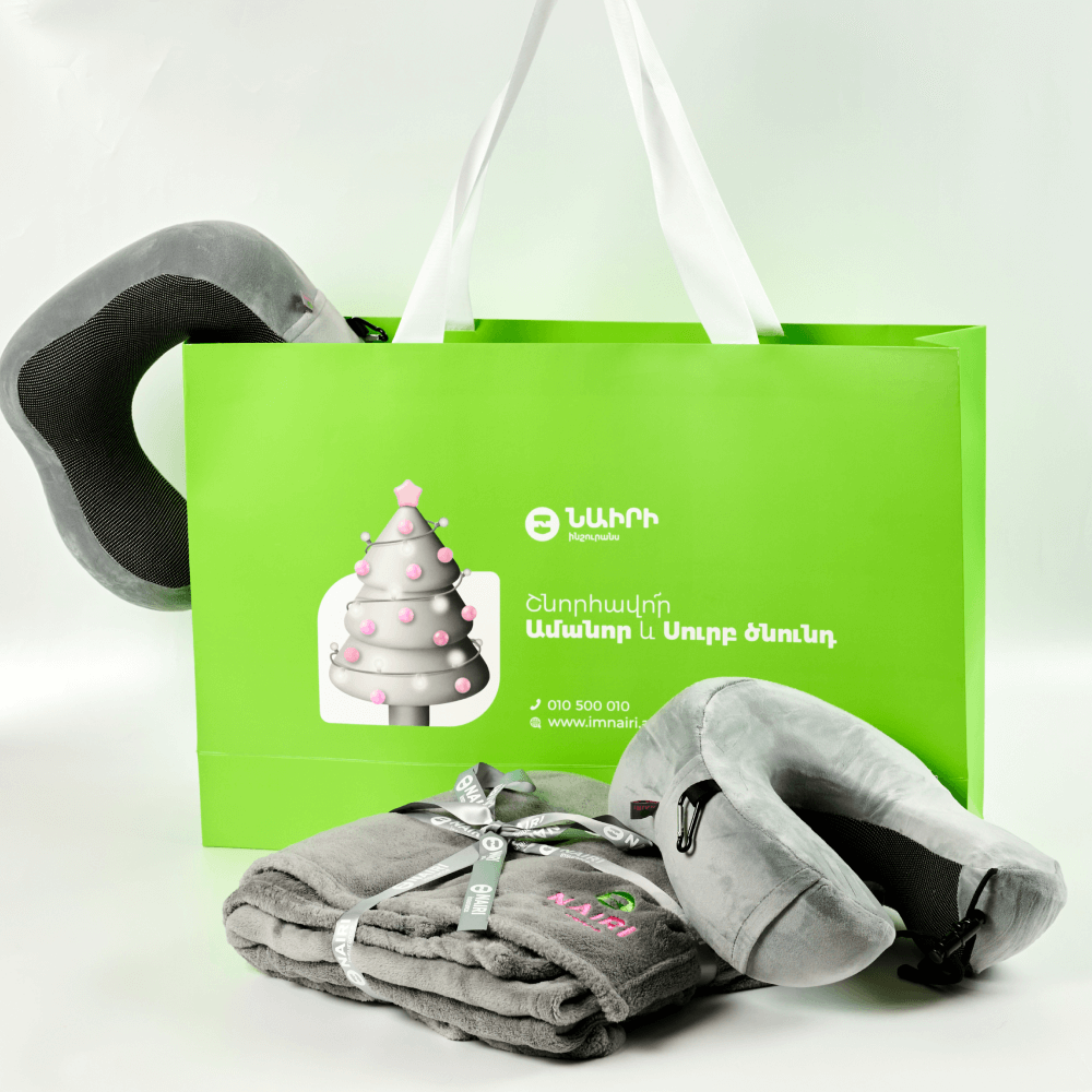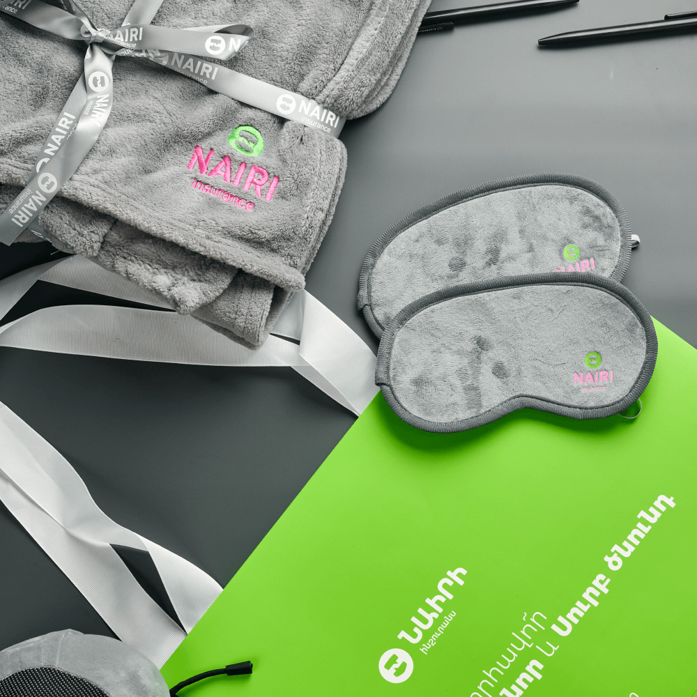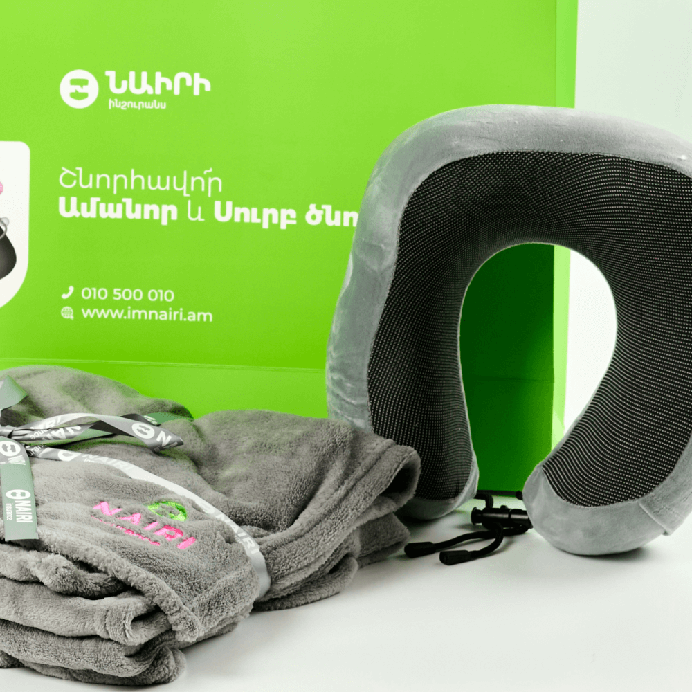 В 2026 году страховая компания Nairi Insurance поздравила ключевых партнёров и сотрудников набором для комфортных поездок. В комплект вошли анатомическая подушка «Dream» с эффектом памяти, маска для сна и мягкий плед из длинноворсового флиса. Подарок собран так, чтобы получатель чувствовал заботу бренда не только в офисе, но и в дороге, в самолёте или дома на диване.