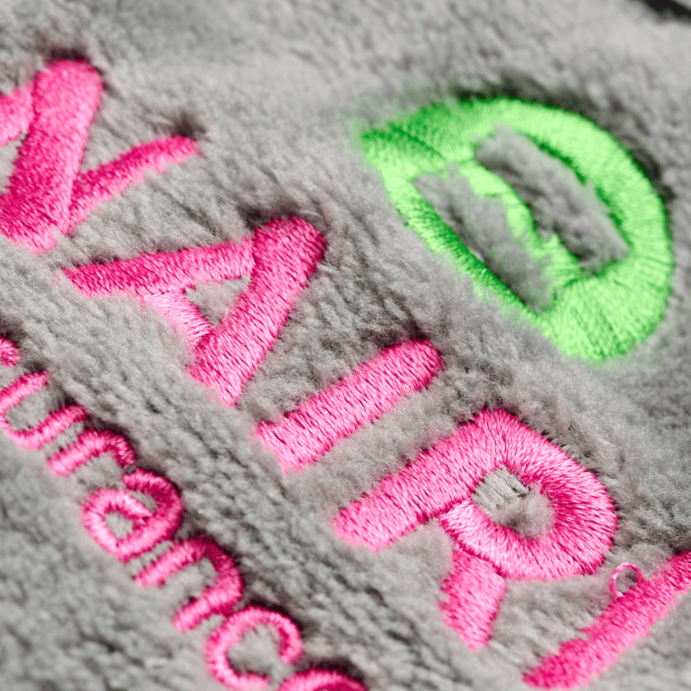 Плед из плотного флиса (125×150 см) даёт приятное тепло и ощущение уюта. Длинный ворс красиво играет в свете и подчёркивает объёмную многоцветную вышивку логотипа. Дополнительно мы использовали фирменную ленту с тиснением, которая фиксирует плед в аккуратном рулоне и делает его самостоятельным подарком, его удобно хранить в офисе, брать в дорогу или на летние террасы.
