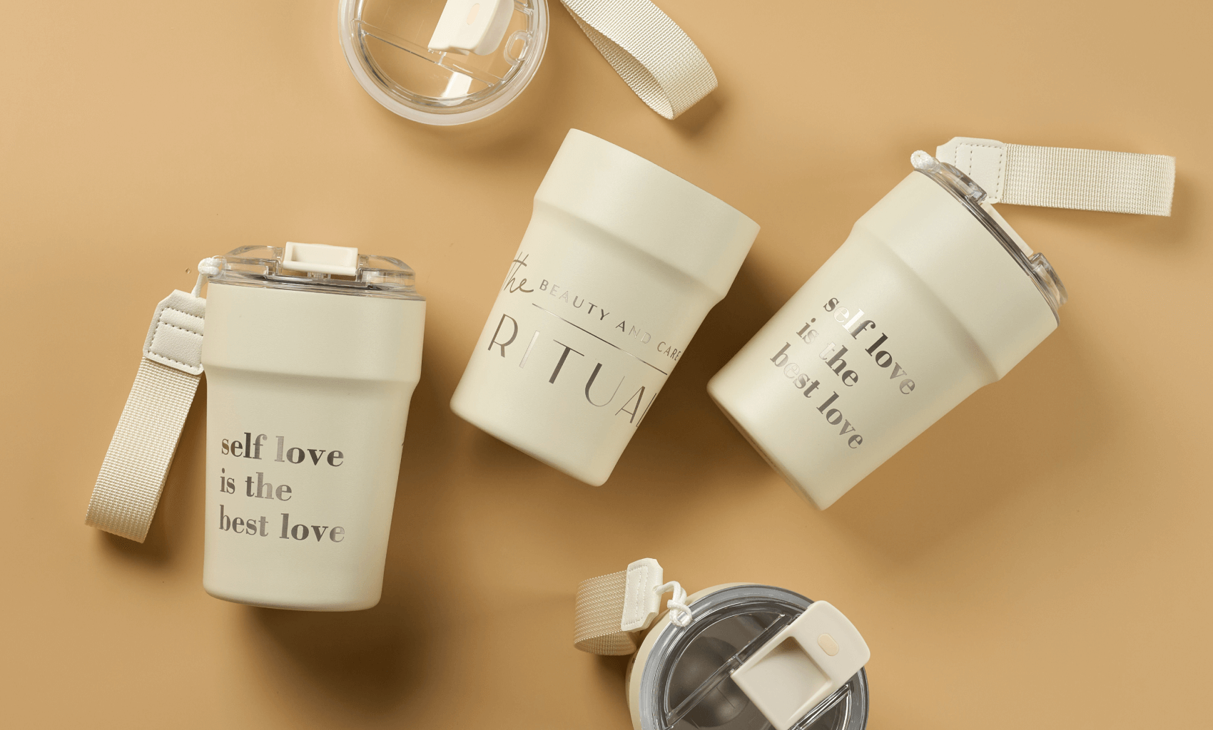 Для салона красоты Ritual мы разработали коллекцию премиальной термопосуды в спокойной бежевой гамме. Форма бутылок и термокружек вытянутая, изящная, без лишних деталей. Матовая поверхность с мягким тактильным эффектом поддерживает эстетику care и дополняет интерьер салона. Такой мерч гармонично смотрится на ресепшене, в кабинете мастера и в сумке клиента и не спорит с визуальной концепцией бренда.