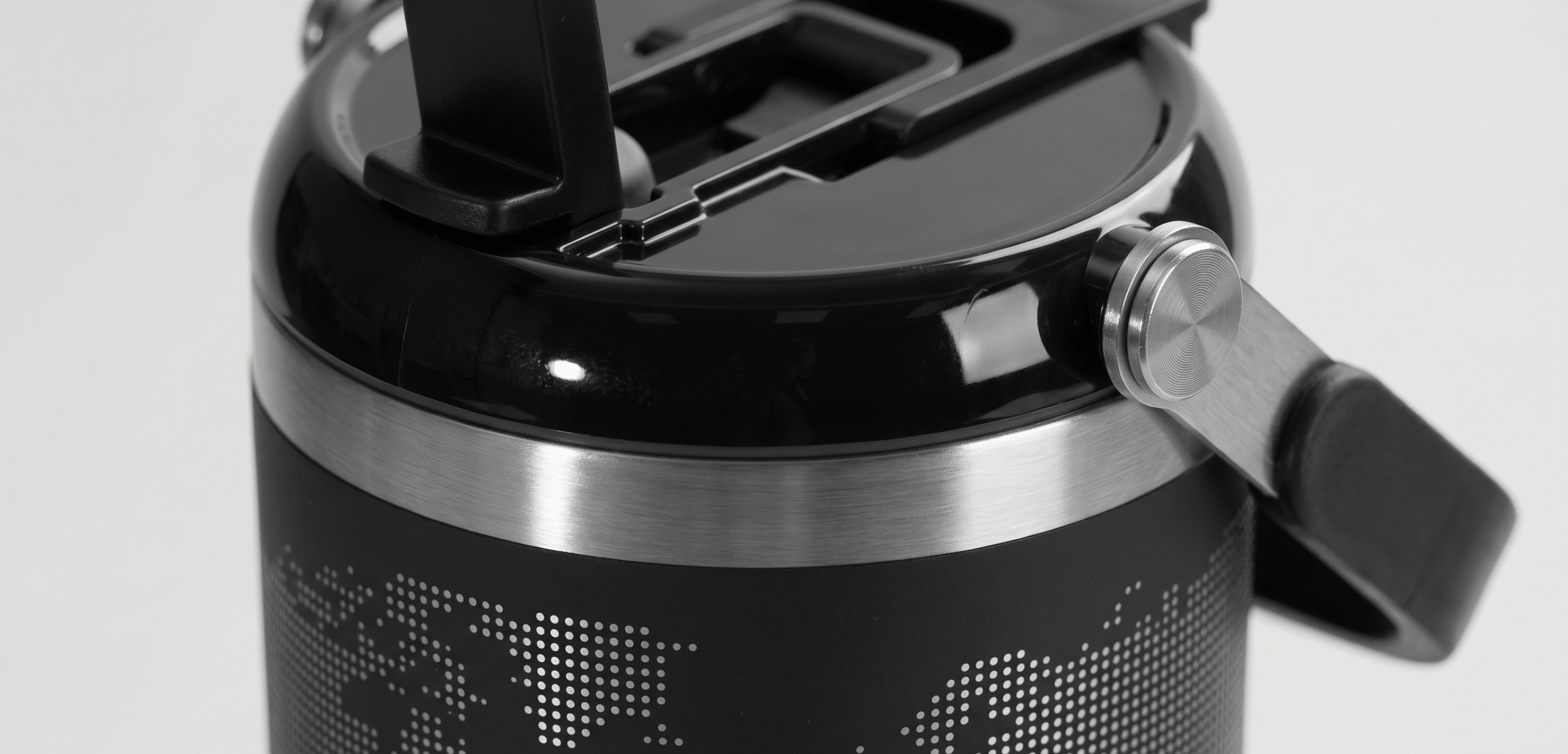 Ключевой акцент в наборе сделан на термокружке с круговой УФ-печатью: нанесение охватывает почти всю видимую поверхность, точно передает фирменную графику, слоган и карту мира, а за счет матовой черной основы, металлических деталей и светлого принта кружка выглядит технологично, статусно и совсем не воспринимается как стандартный сувенир. Набор дополняет яркий красный кардхолдер с заметной фактурой материала и аккуратным тиснением логотипа, который усиливает фирменный акцент и добавляет композиции контраст. Общую концепцию поддерживает коробка с полноцветной печатью, выверенной типографикой и крупными сообщениями, поэтому упаковка здесь работает как полноценная часть подарка и усиливает впечатление от всего проекта.