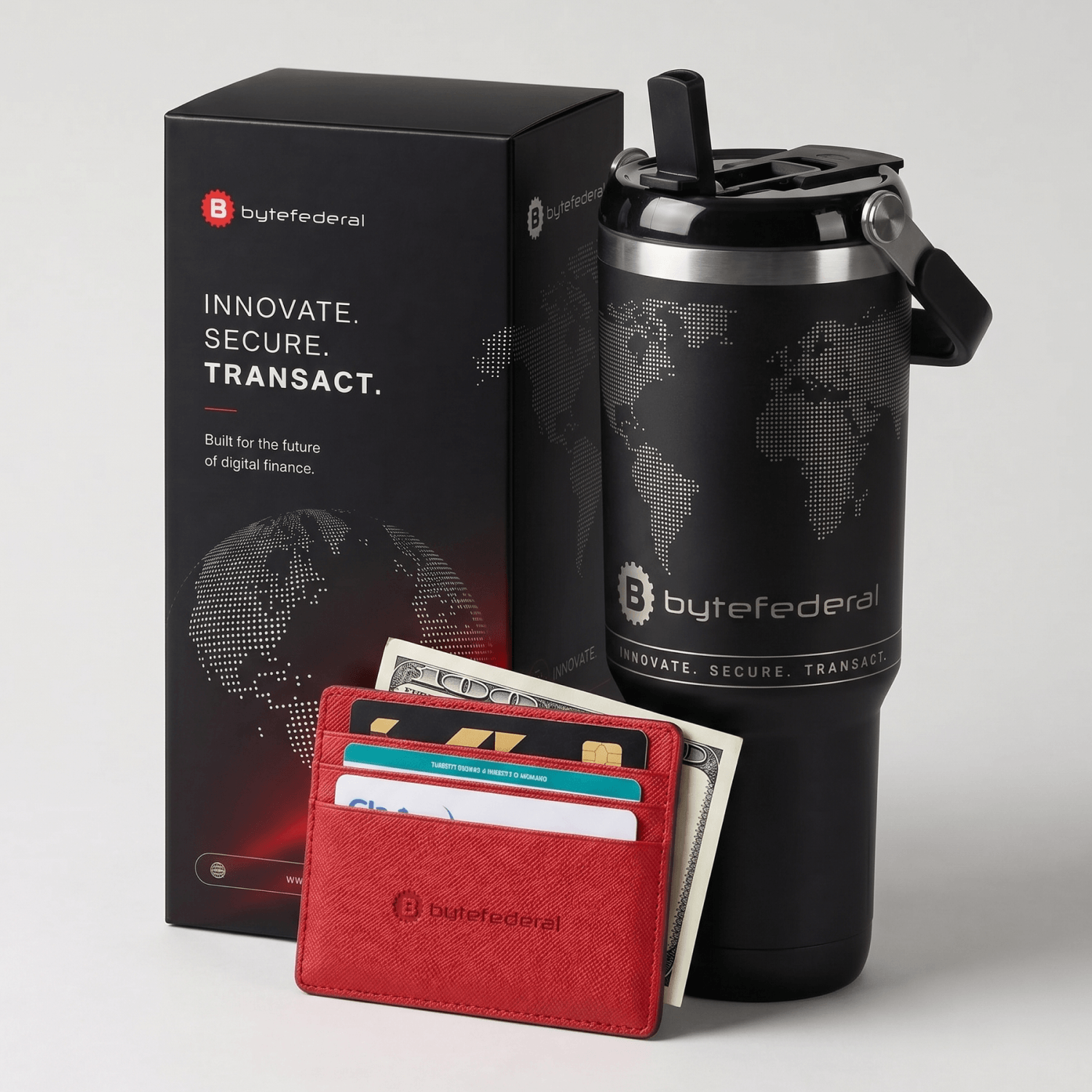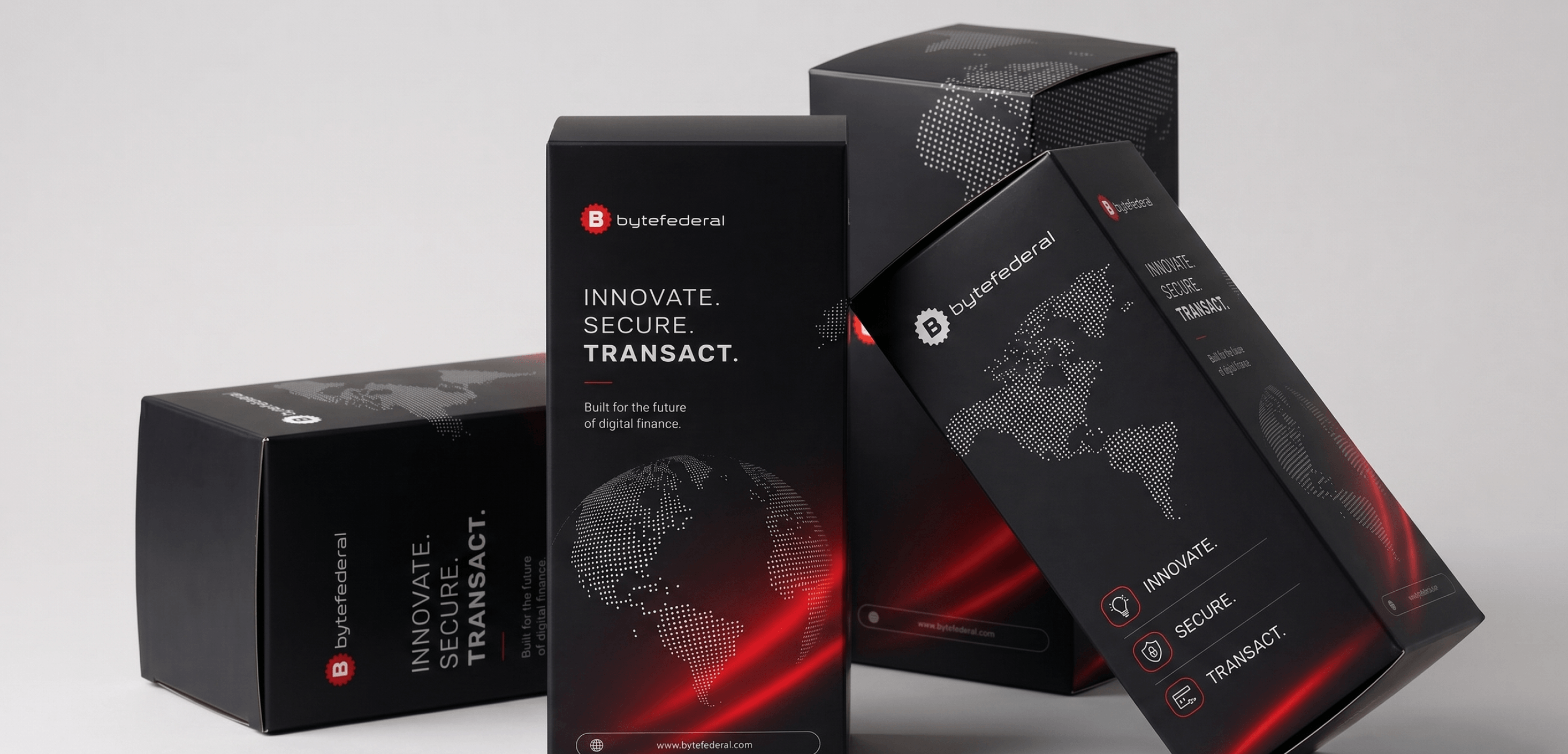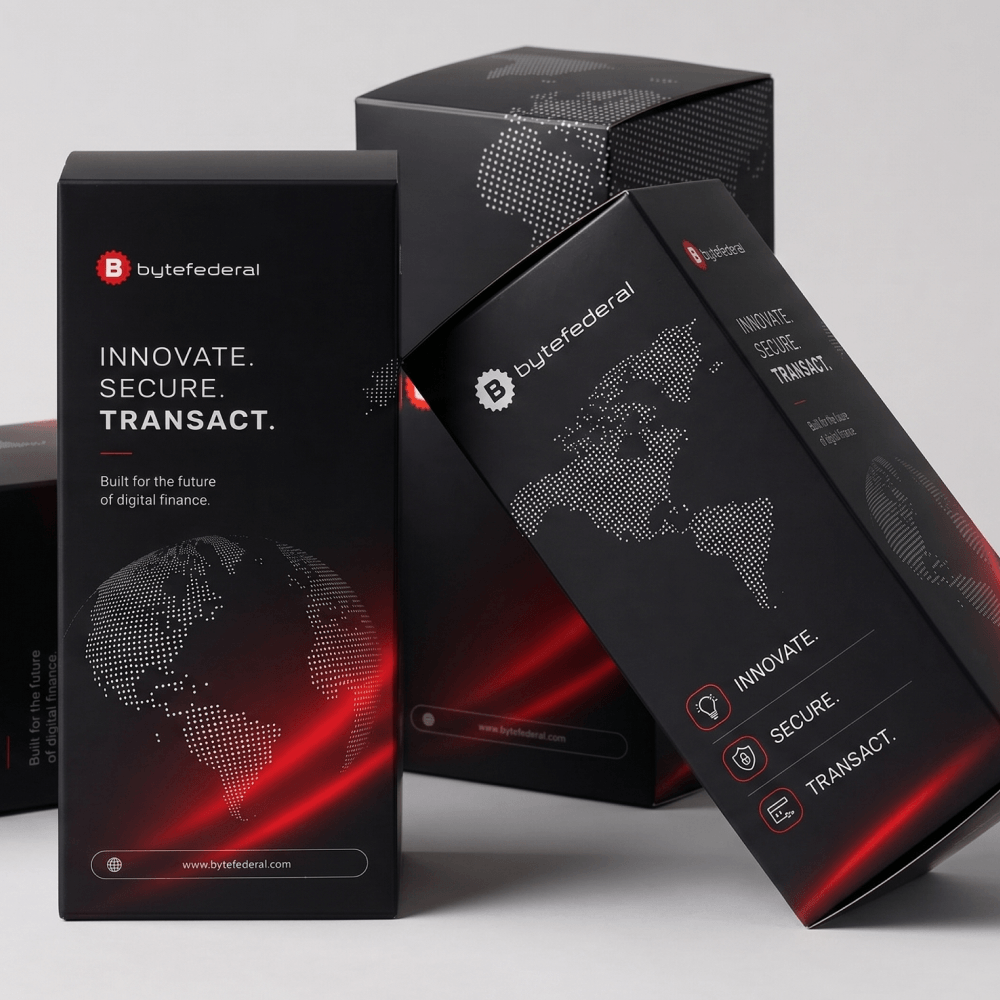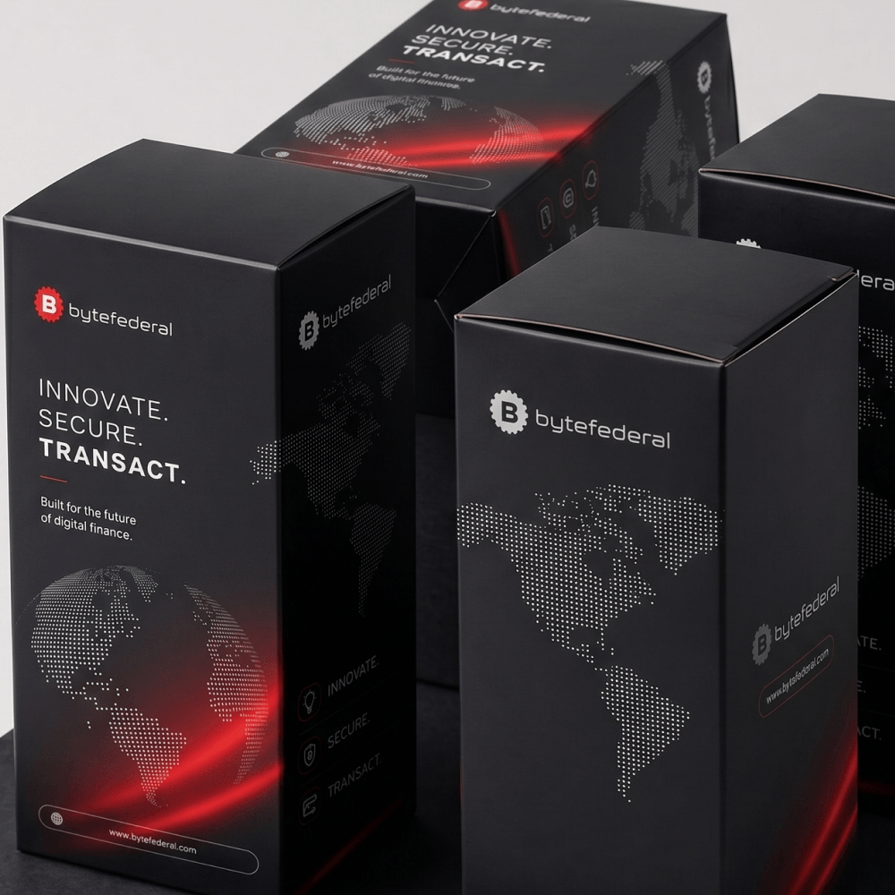 Для ByteFederal мы разработали корпоративный подарочный набор в сильной и цельной визуальной системе. В проект вошли высокая фирменная коробка, термокружка большого объема и компактный кардхолдер. Визуальный язык строится на глубоком черном фоне, контрастной белой графике, красных световых акцентах и карте мира, которая подчеркивает международный и технологичный характер бренда.
