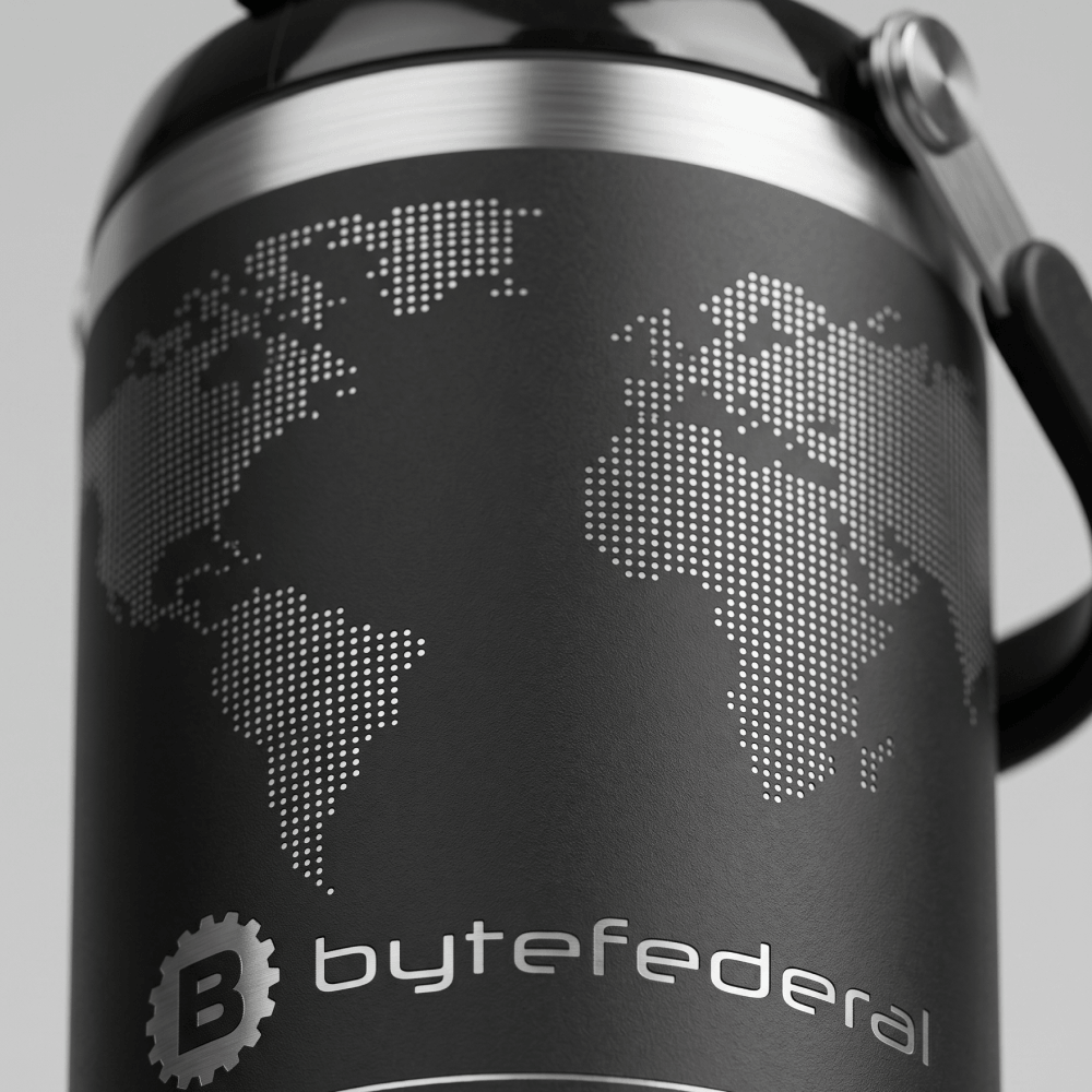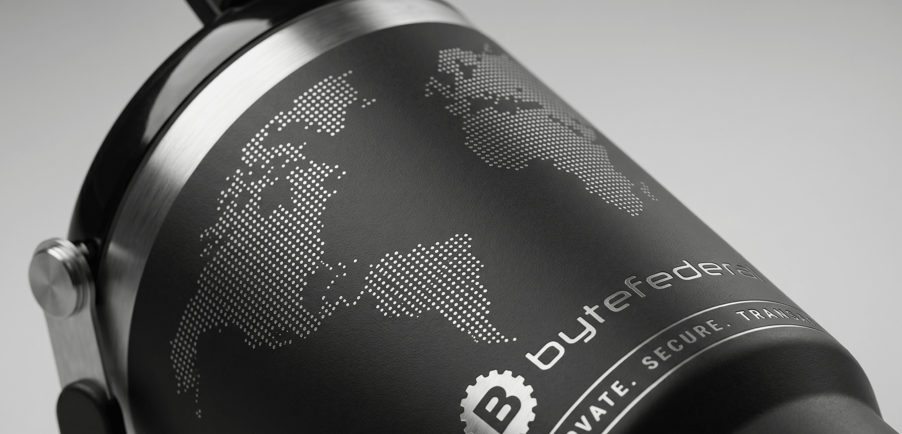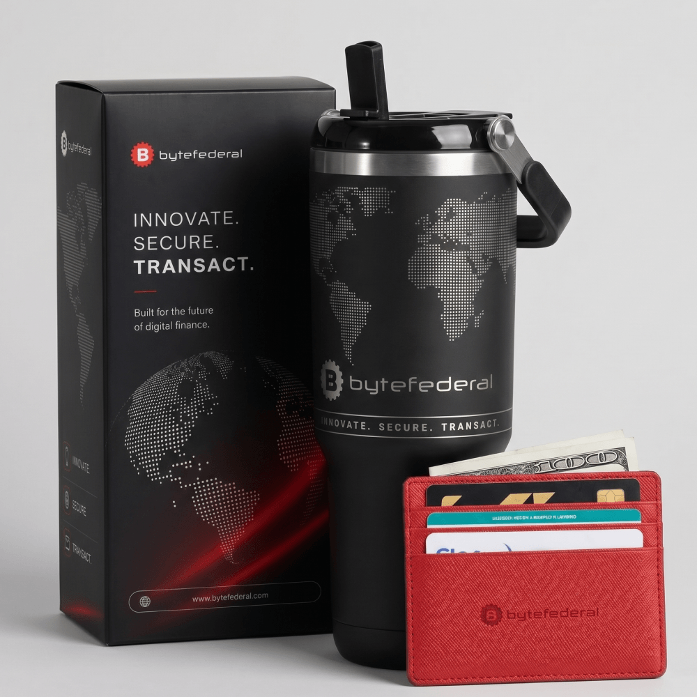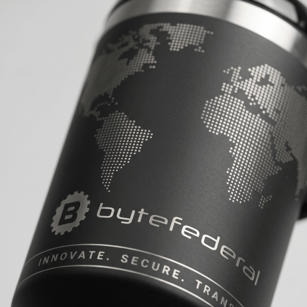 Для ByteFederal мы разработали корпоративный подарочный набор в сильной и цельной визуальной системе. В проект вошли высокая фирменная коробка, термокружка большого объема и компактный кардхолдер. Визуальный язык строится на глубоком черном фоне, контрастной белой графике, красных световых акцентах и карте мира, которая подчеркивает международный и технологичный характер бренда.