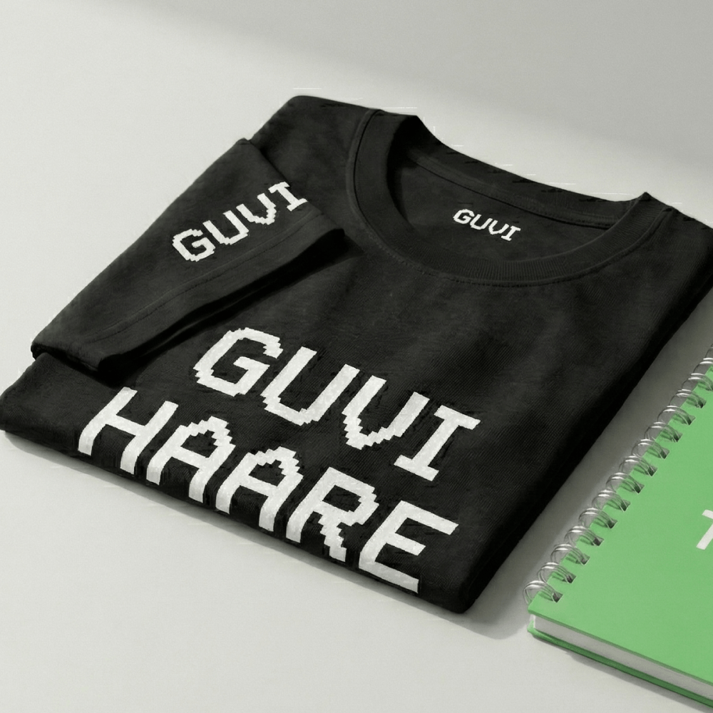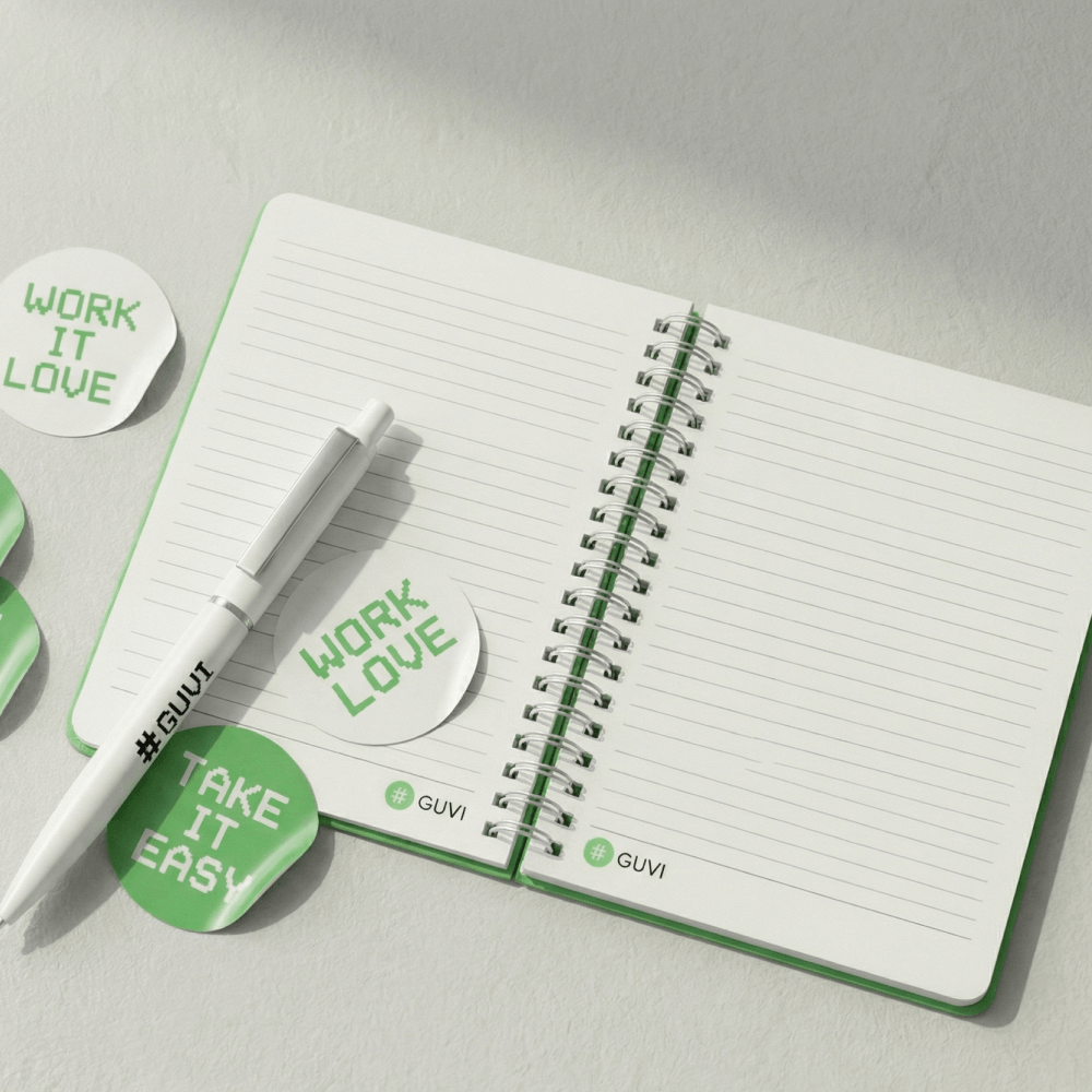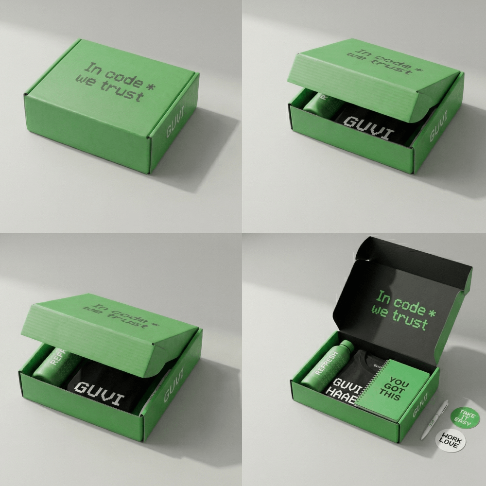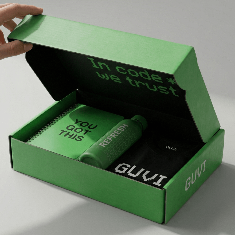 В welcome kit для GUVI мы использовали коробку из гофрокартона с полноцветной печатью и фирменным сообщением внутри, круговую УФ печать на бутылке для заметного и стойкого брендинга, блокнот с логотипом и кастомной обложкой в общей digital-концепции, ручку с логотипом в фирменной цветовой гамме и футболку с принтом как часть современного IT welcome pack.
