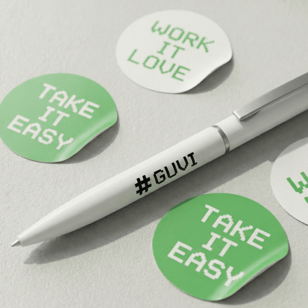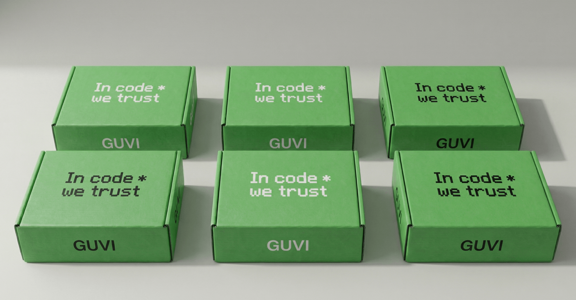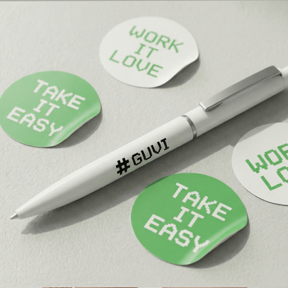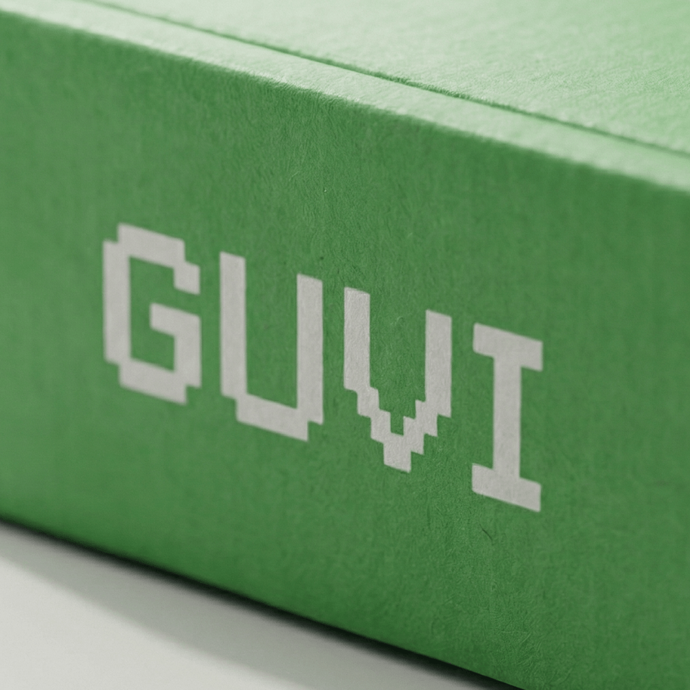 В welcome kit для GUVI мы использовали коробку из гофрокартона с полноцветной печатью и фирменным сообщением внутри, круговую УФ печать на бутылке для заметного и стойкого брендинга, блокнот с логотипом и кастомной обложкой в общей digital-концепции, ручку с логотипом в фирменной цветовой гамме и футболку с принтом как часть современного IT welcome pack.